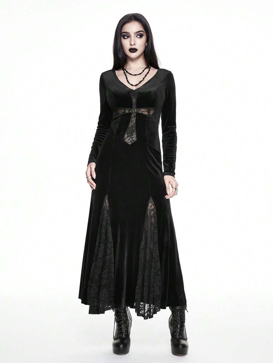 Robe moulante vintage gothique sombre avec motif croix ajouré en dentelle pour femmes
