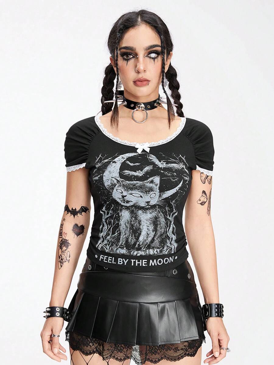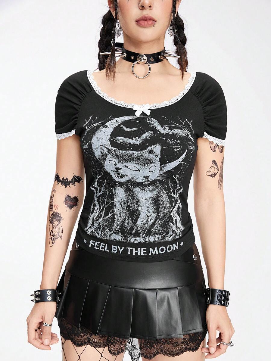 Goth T-shirt noir à la taille rassemblée imprimée d'un chat à deux têtes pour femmes