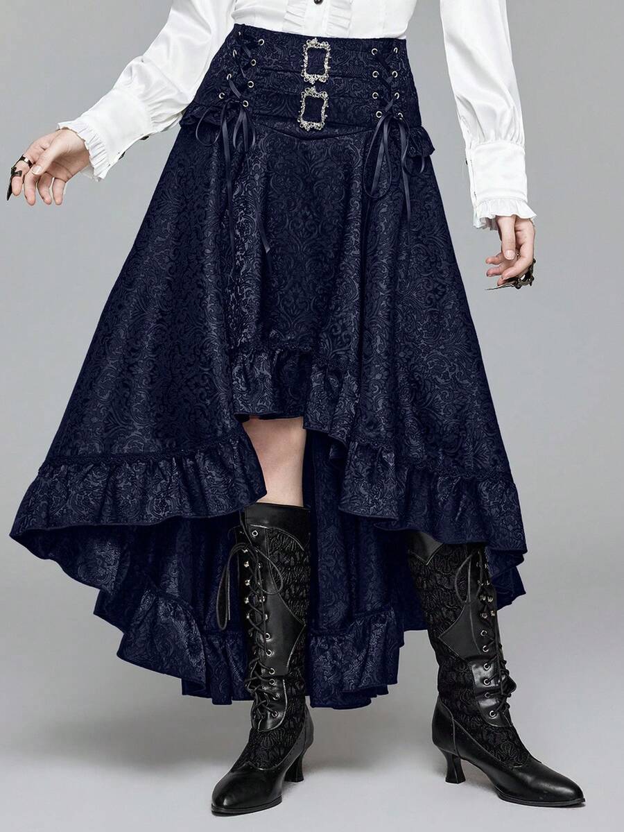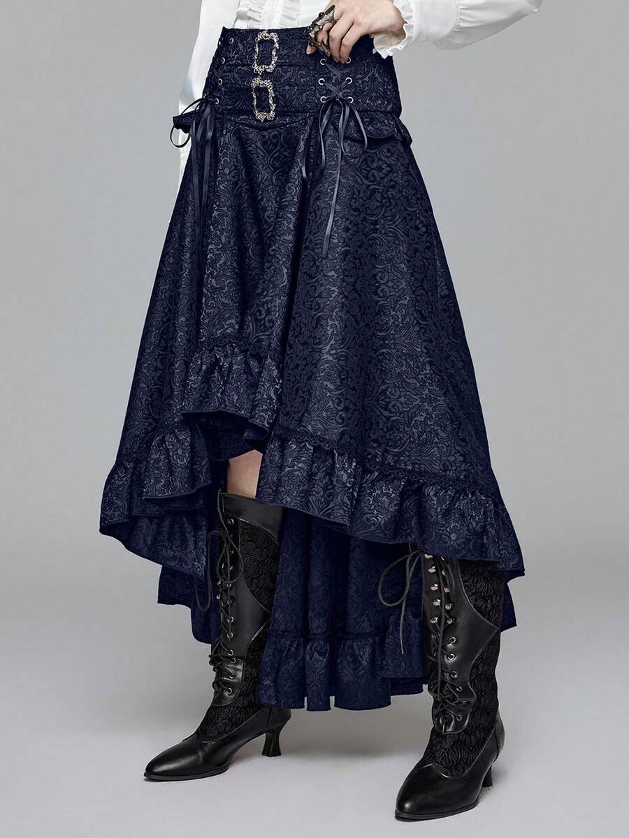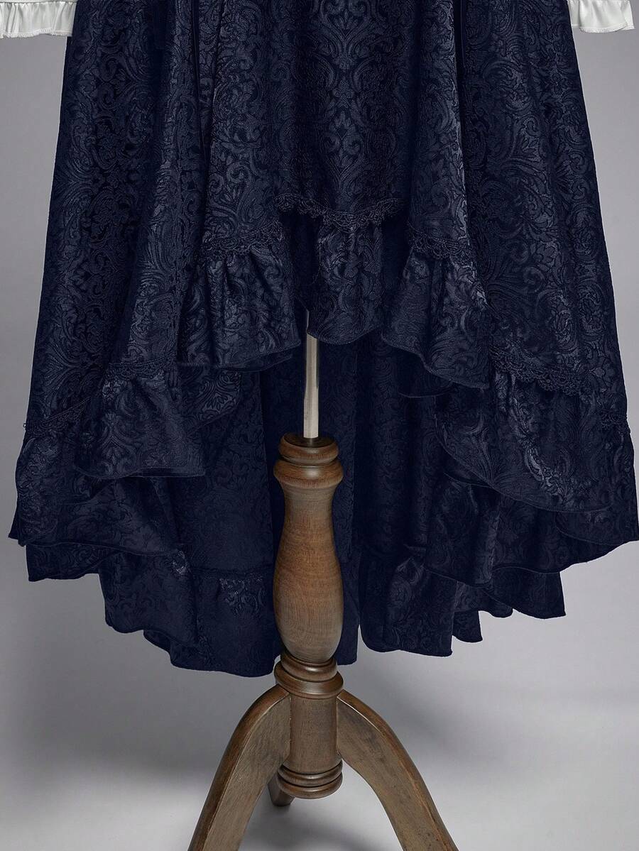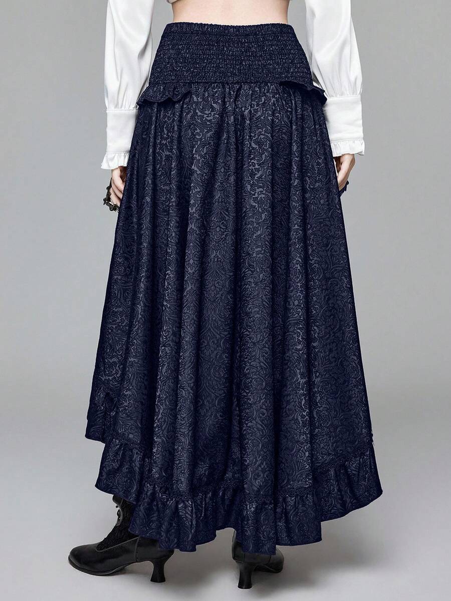 Goth Jupe courte devant, longue derrière, taille haute, style vintage, motif jacquard, coupe évasée pour femmes