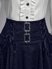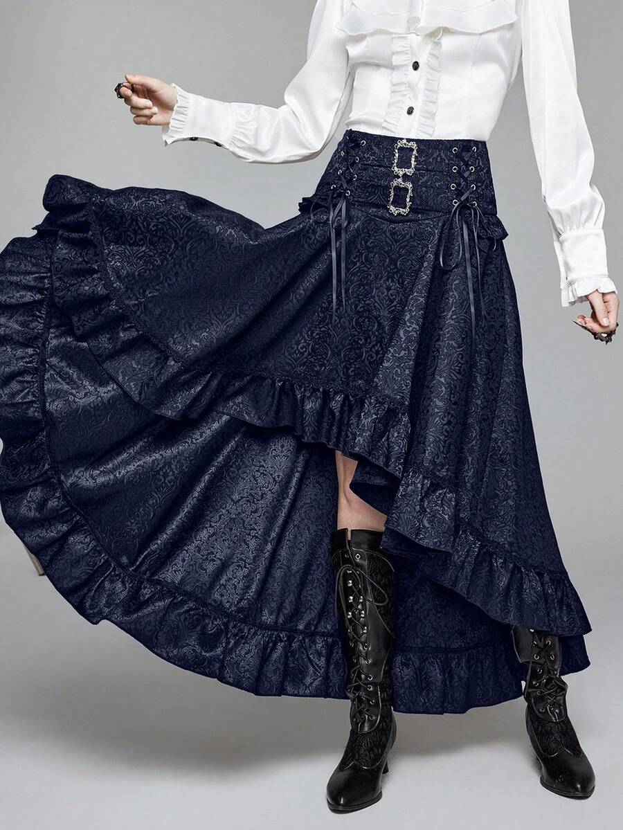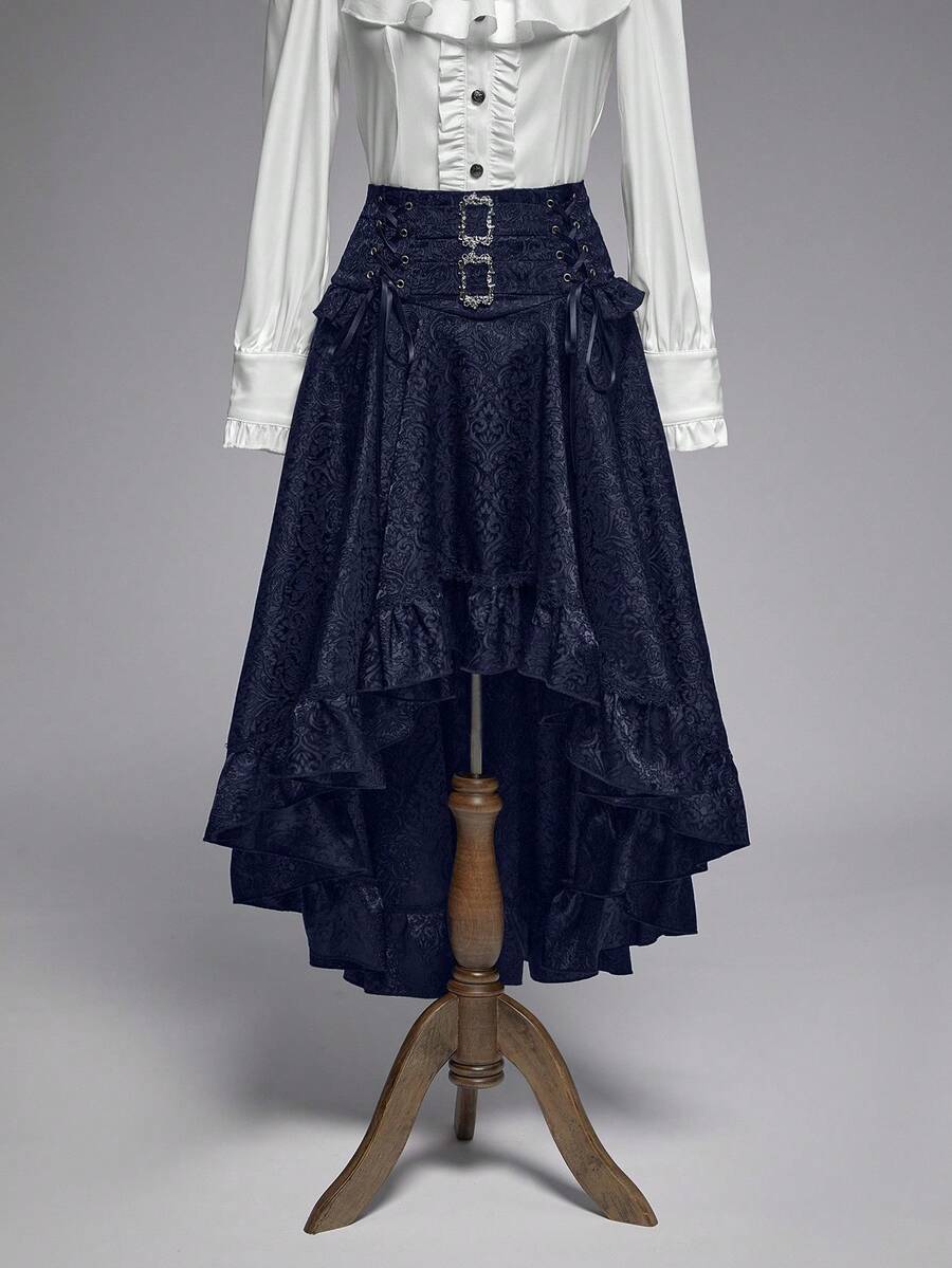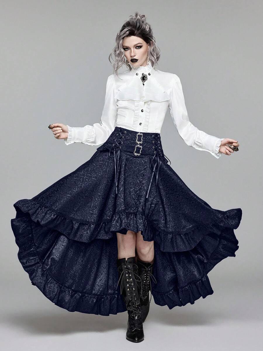 Goth Jupe courte devant, longue derrière, taille haute, style vintage, motif jacquard, coupe évasée pour femmes