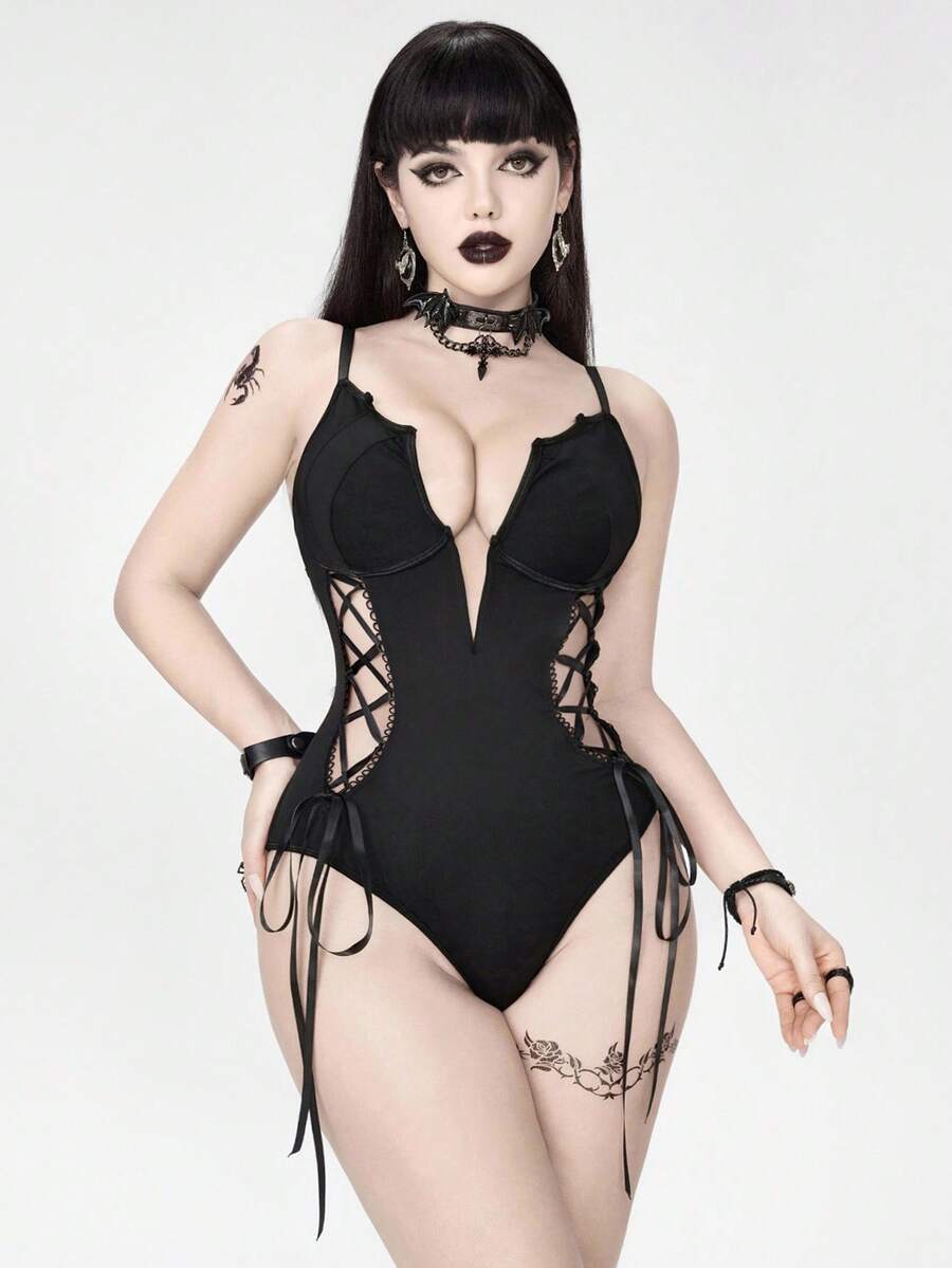 Combinaison sexy gothique pour femmes avec nœud papillon, motif chauve-souris ajouré et laçage