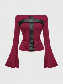 T-shirt slim femme à col bénitier avec croix gothique ajourée et floquée