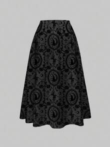 Jupe femme imprimée intégrale gothique, palais sombre, chat noir mystérieux, croix, vigne, rose, soleil, lune, étoile