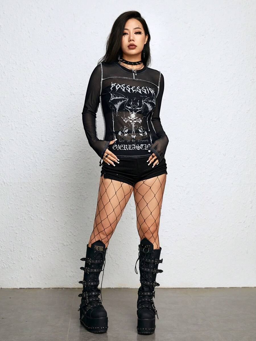Blouse à mailles transparentes de décoration graphique vintage sombre gothique pour femmes