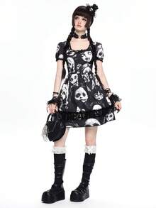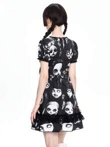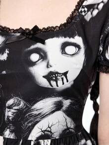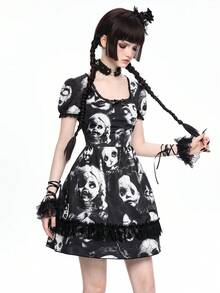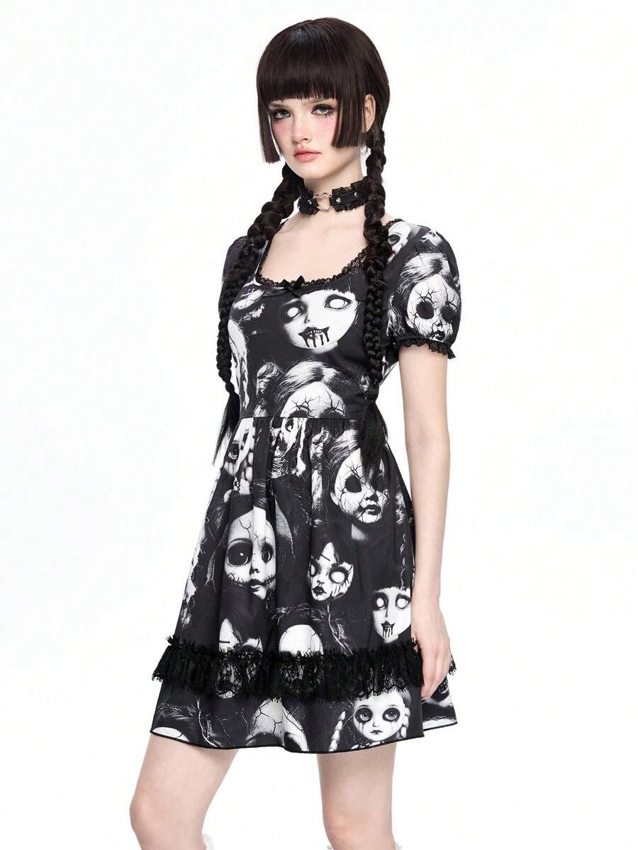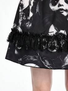 Robe courte pour femmes avec imprimé de poupée en patchwork de dentelle gothique sombre
