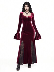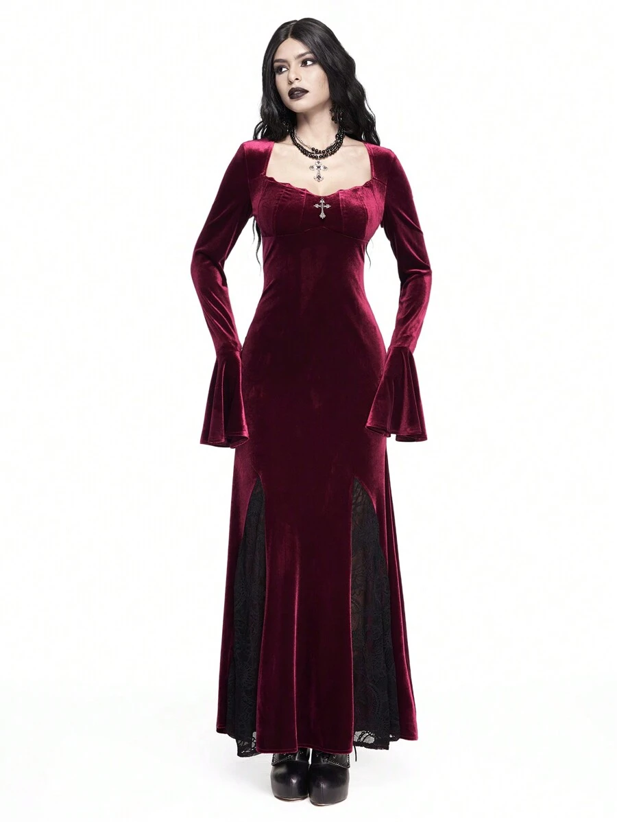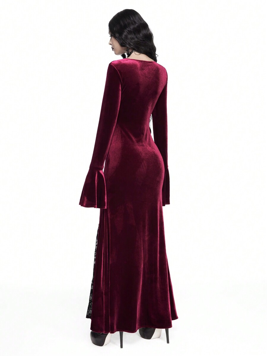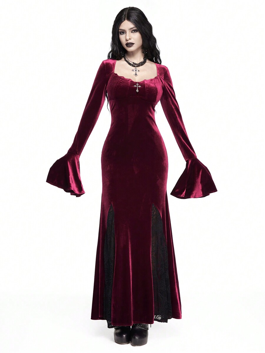Robe maxi ajustée évasée aux manches évasées, avec col de chauve-souris gothique élégant, patchwork de dentelle, couleur rouge vin avec queue de poisson