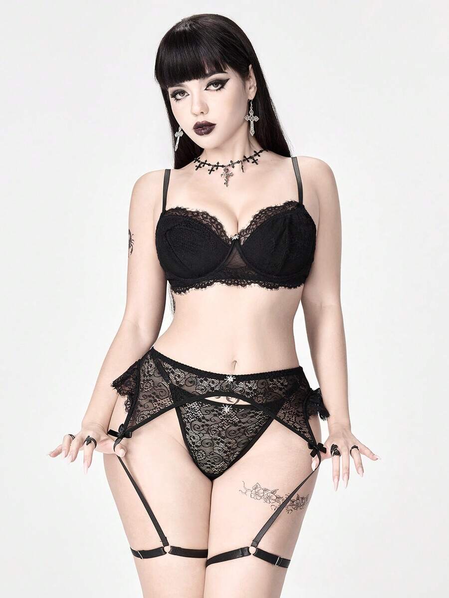 Ensemble de soutien-gorge à armatures et string en dentelle gothique florale avec pendentifs en métal araignée, ensemble de lingerie sexy