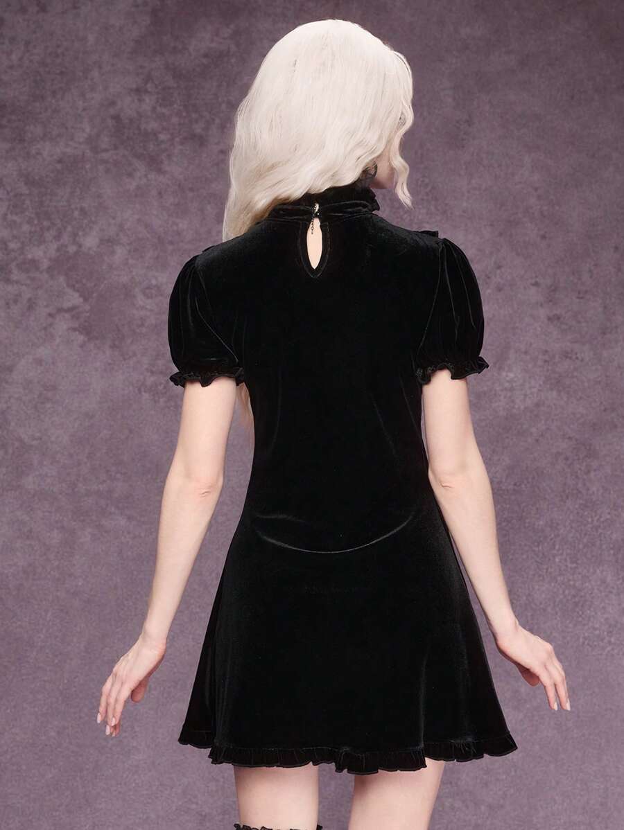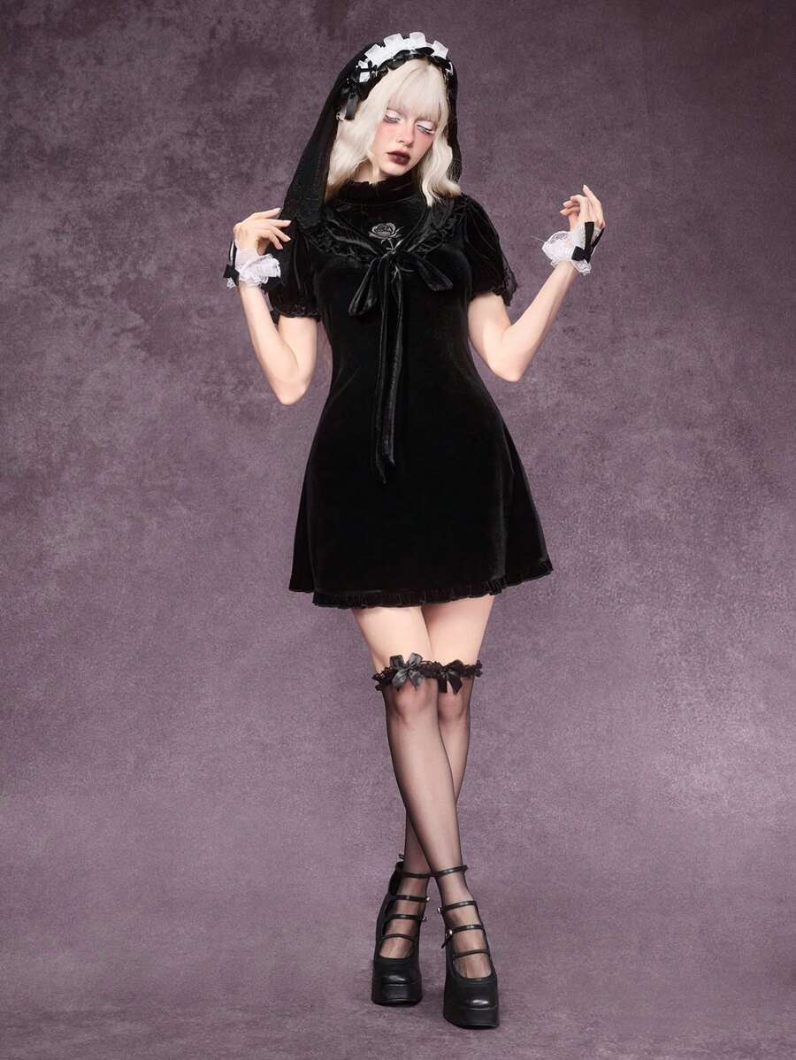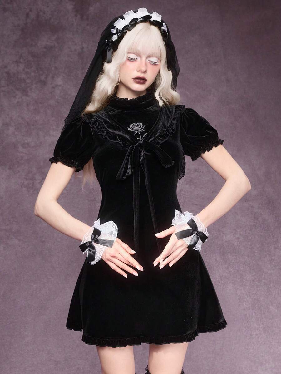 Robe mini gothique Lolita élégante en velours avec rose brodée, manches bouffantes, nœud papillon et jupe amovible pour femmes