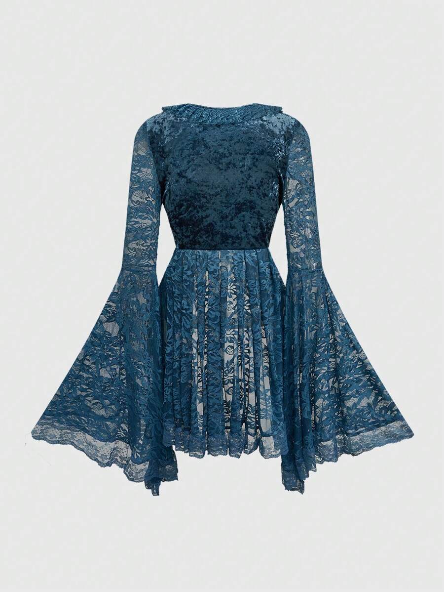 Blouse en velours gothique style palais avec manches cloche et épaules dénudées, effet de contraste avec de la dentelle