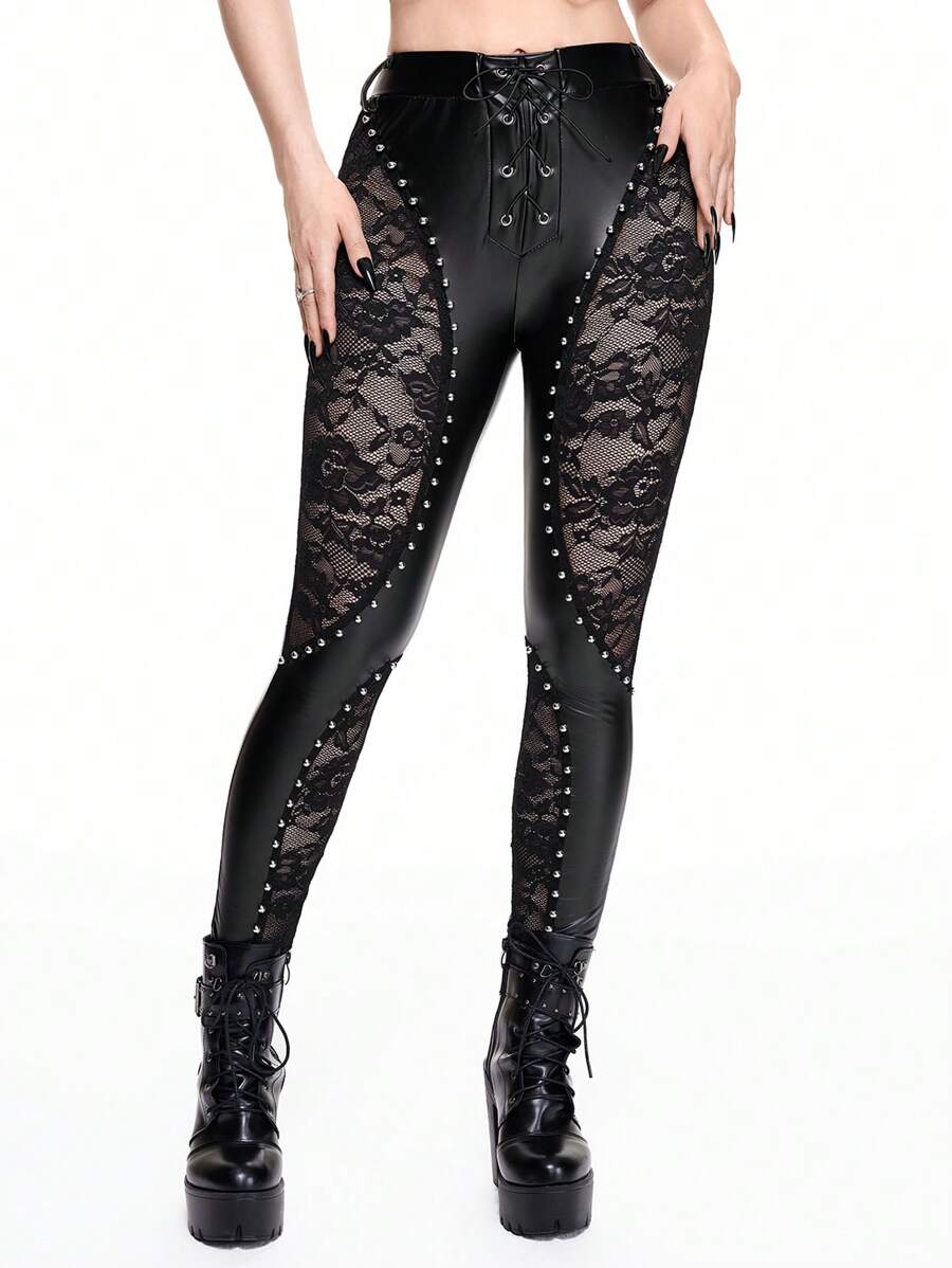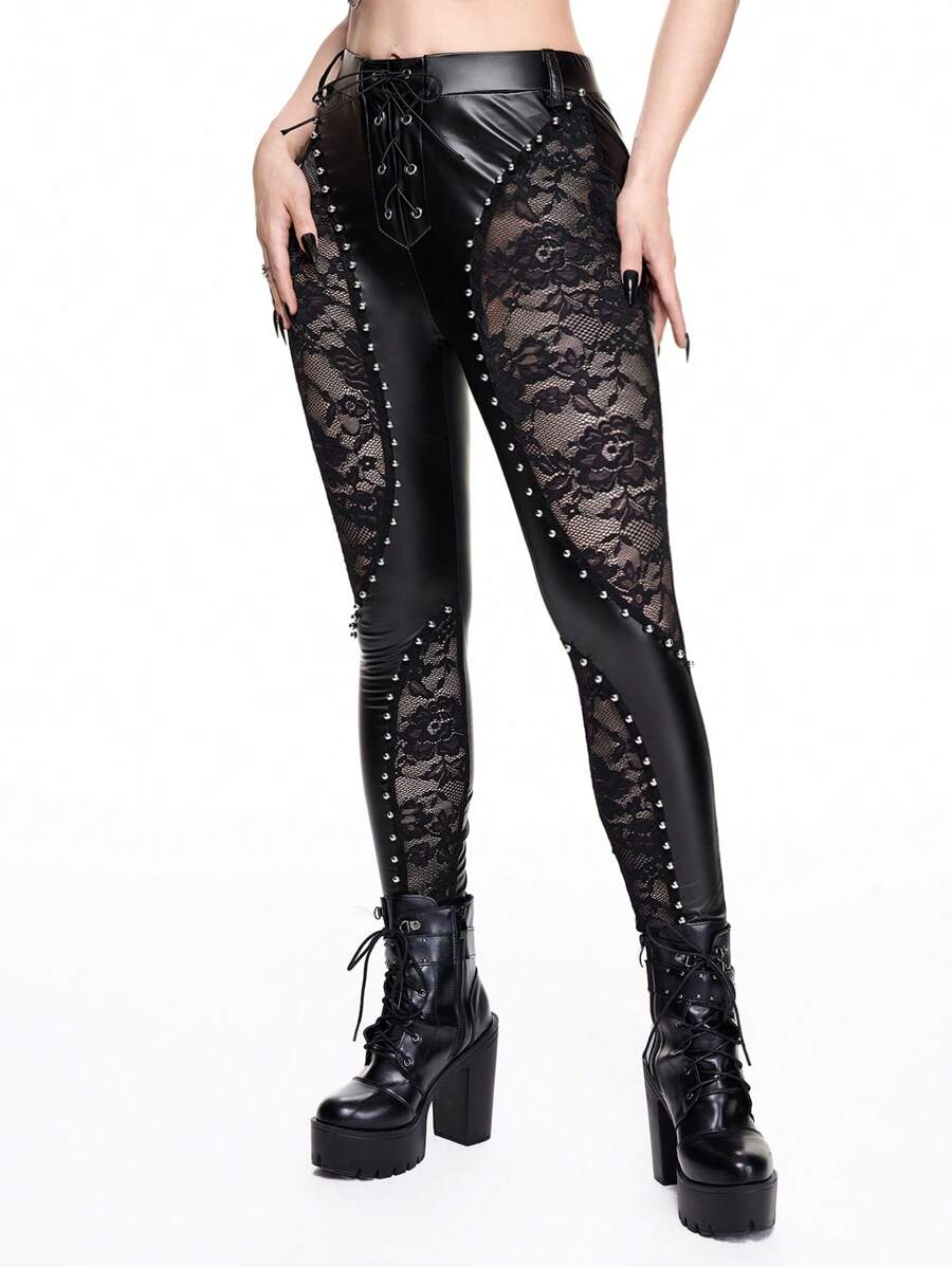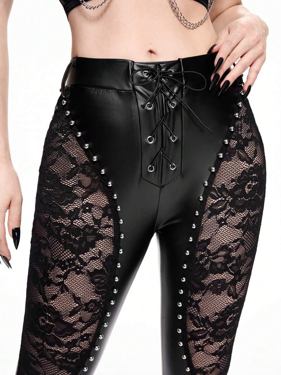 Pantalon gothique effet puissance en PU et patchwork de dentelle, coupe slim évasé