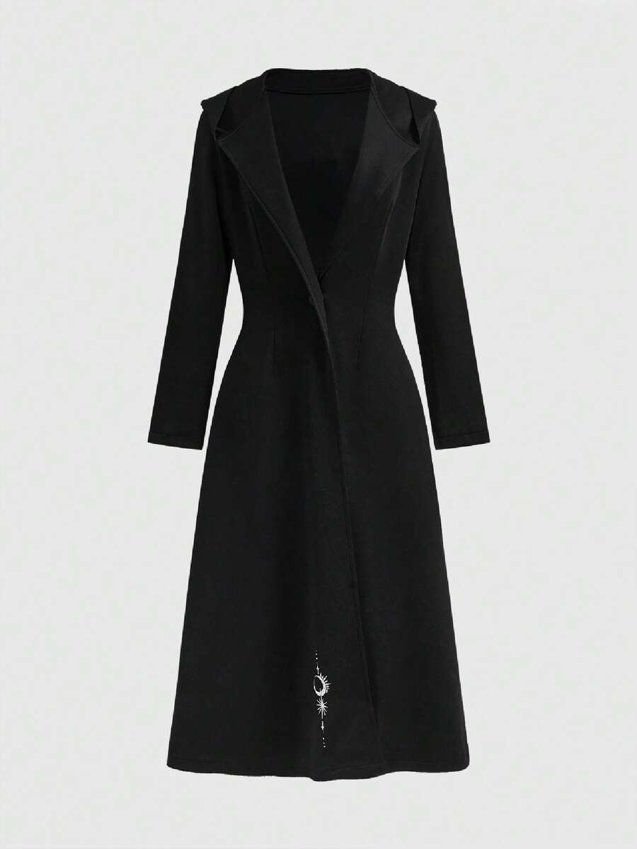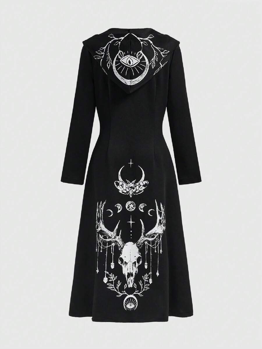 Veste à capuche longue pour femmes avec imprimé de crâne de cerf, étoile, lune, papillon de nuit, feuille et œil dans un style gothique