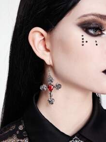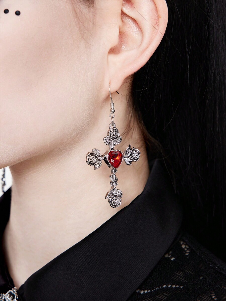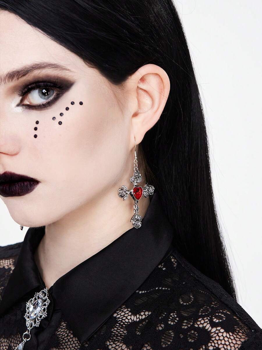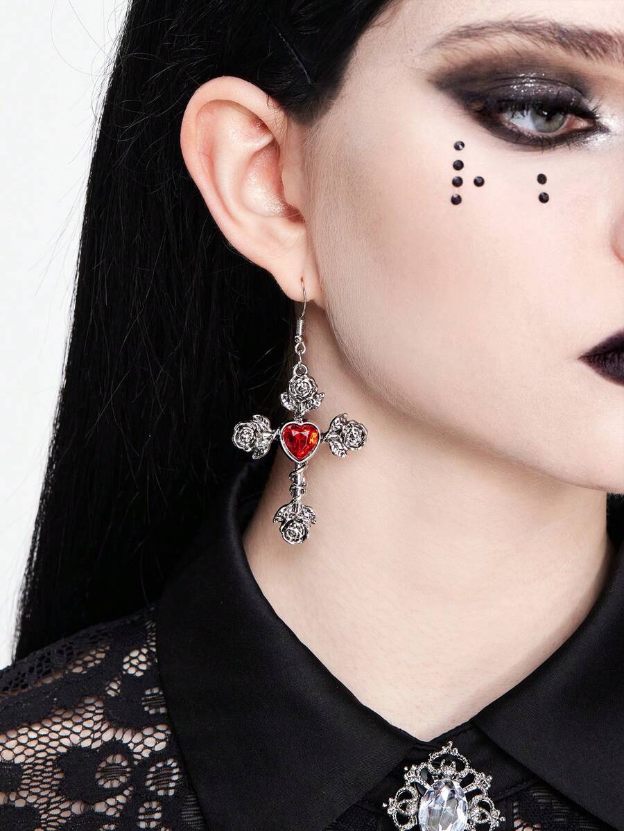(Pré-vente Vampire gothique) 1 paire de boucles d'oreilles croix en argent noir de style gothique foncé avec diamants en forme de rose pour femmes