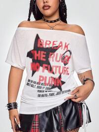 Grunge Punk T-shirt ample décontracté à épaules dénudées avec motif pentagramme punk, grande taille