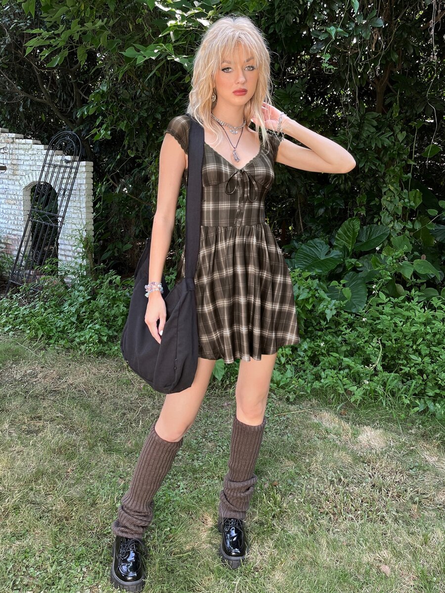 Robe grunge à carreaux à nœud à ourlet en dentelle