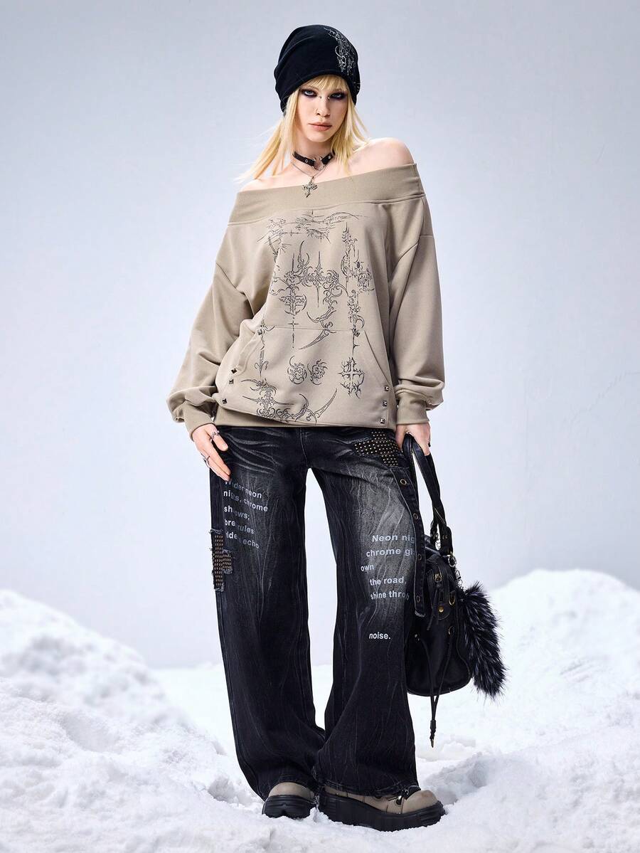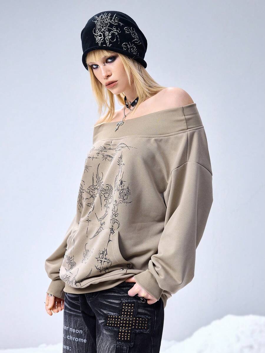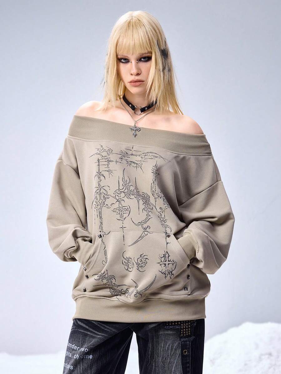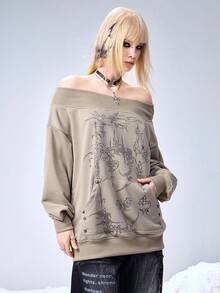 Grunge Punk Sweat-shirt asymétrique à l'épaule Y2K avec imprimé croix d'épine et décoration de rivets, manches longues