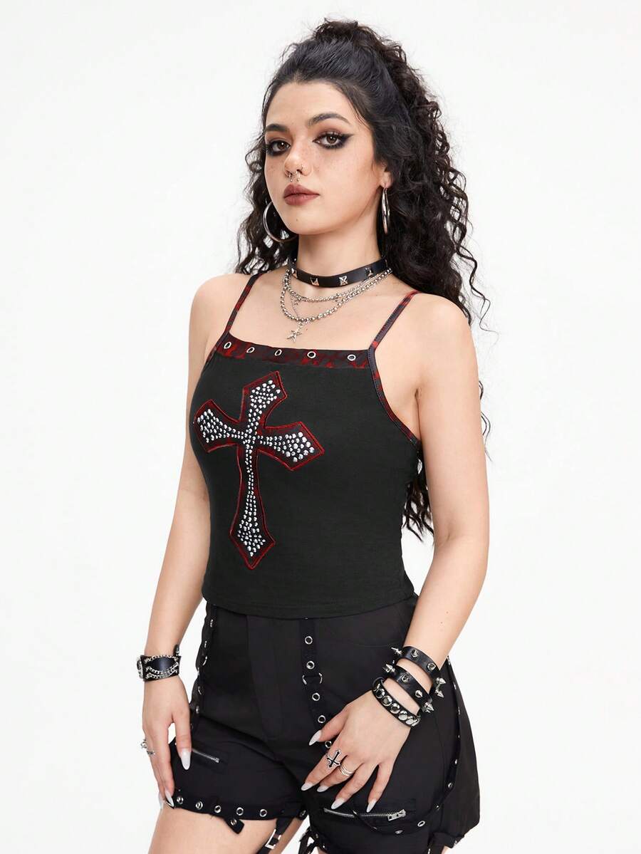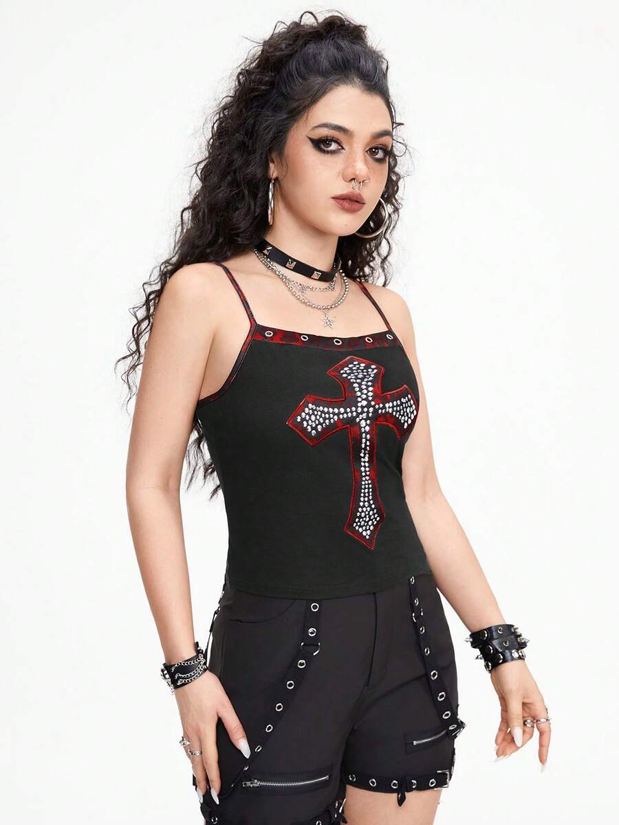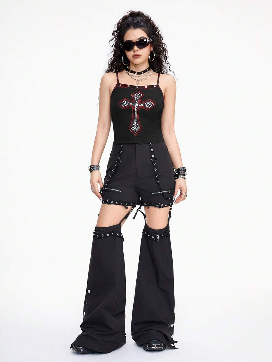 Grunge Punk Débardeur pour femme slim fit en métal sombre et punk Imprimé léopard de forme croisée avec strass
