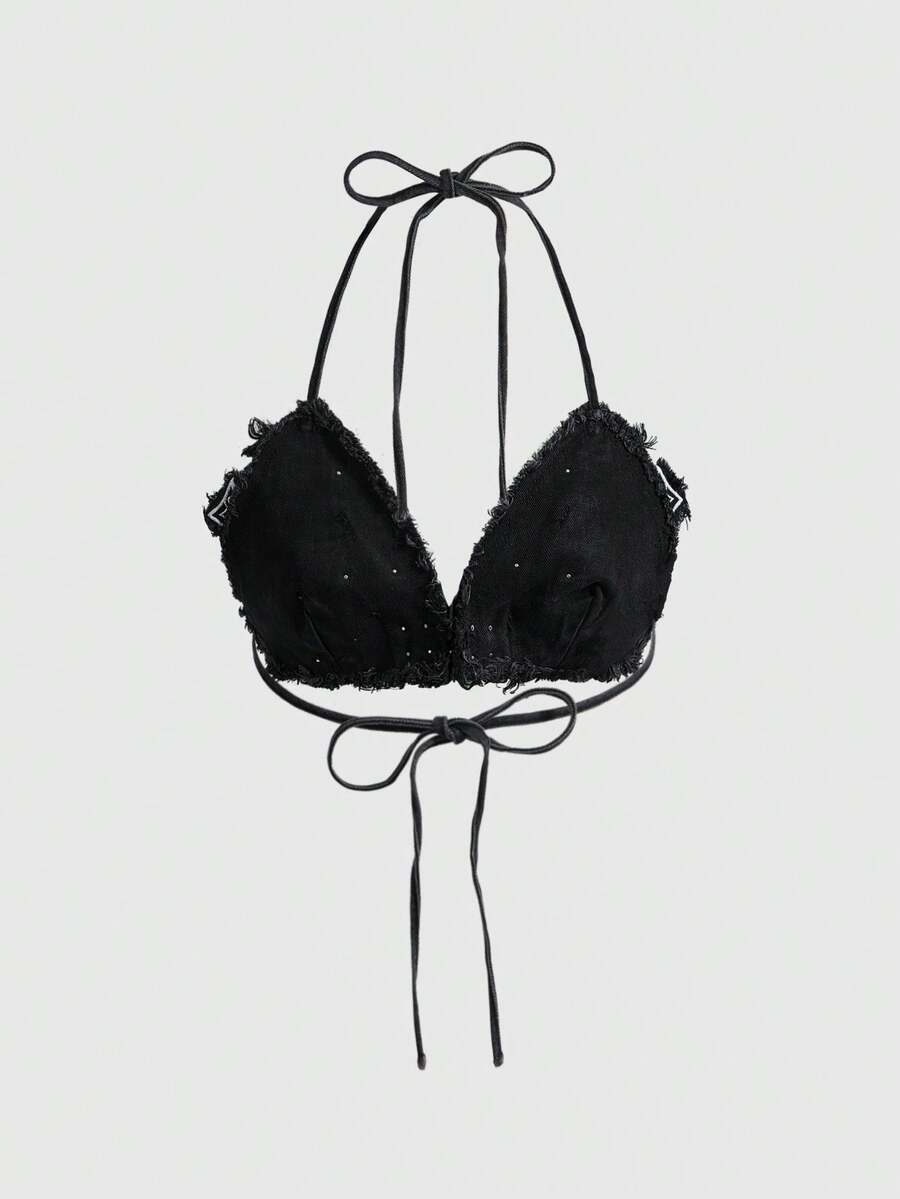Grunge Punk Top court à lacets avec bord effiloché, broderie de croix punk sombre pour femmes