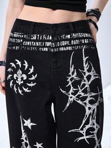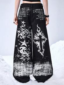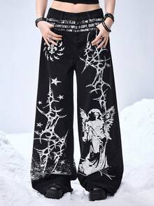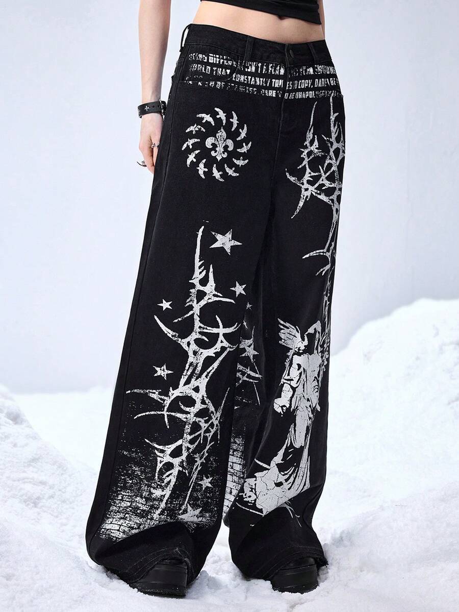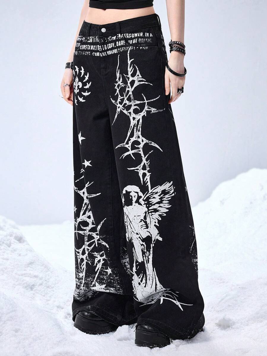 Grunge Punk Jeans évasés pour femmes avec motifs de croix punk sombre, étoiles, épines et mur de briques, style ange
