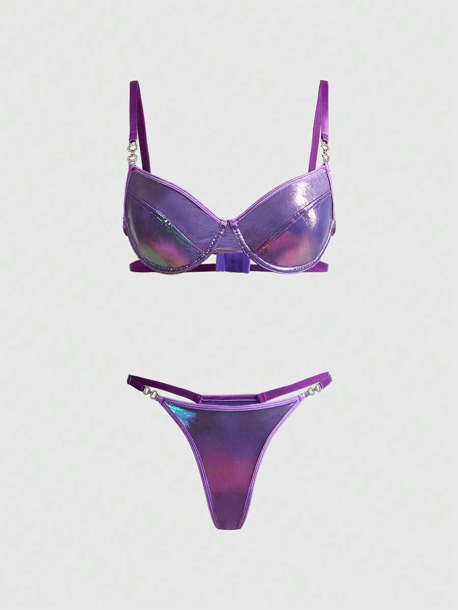 Grunge Punk Ensemble de lingerie sexy comprenant un soutien-gorge avec armatures et un string en tissu enduit avec une chaîne métallique, pour un style punk sombre, idéal pour les festivals de musique