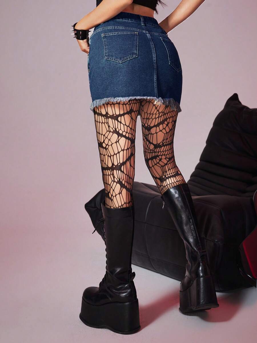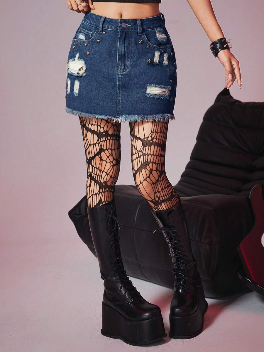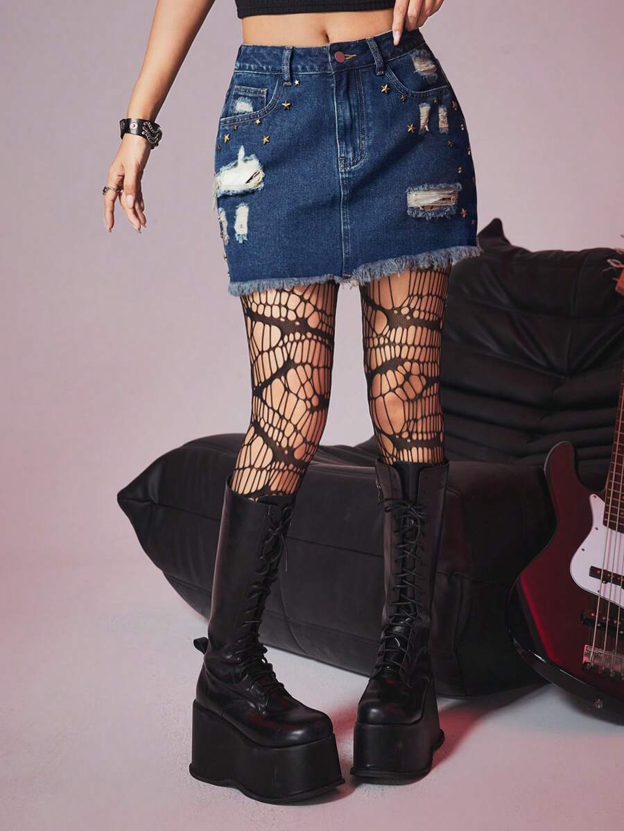 Grunge Punk Jupe En Denim Avec Détails Déchirés, Patchs En Forme D'étoile Et Ourlet En Frange