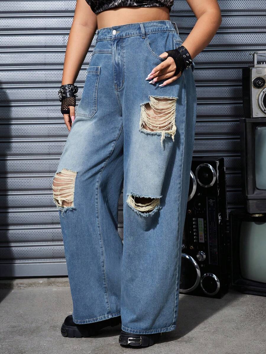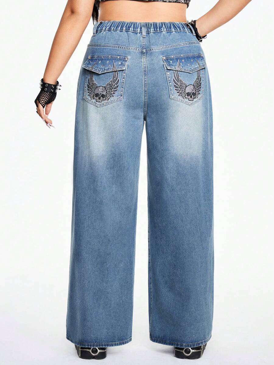 Grunge Punk Jean à jambe large usé et ample avec crânes brodés et perles pour femmes de grande taille