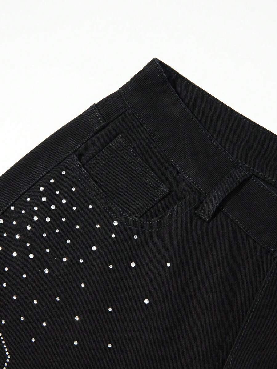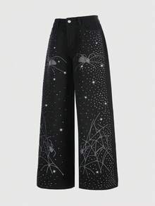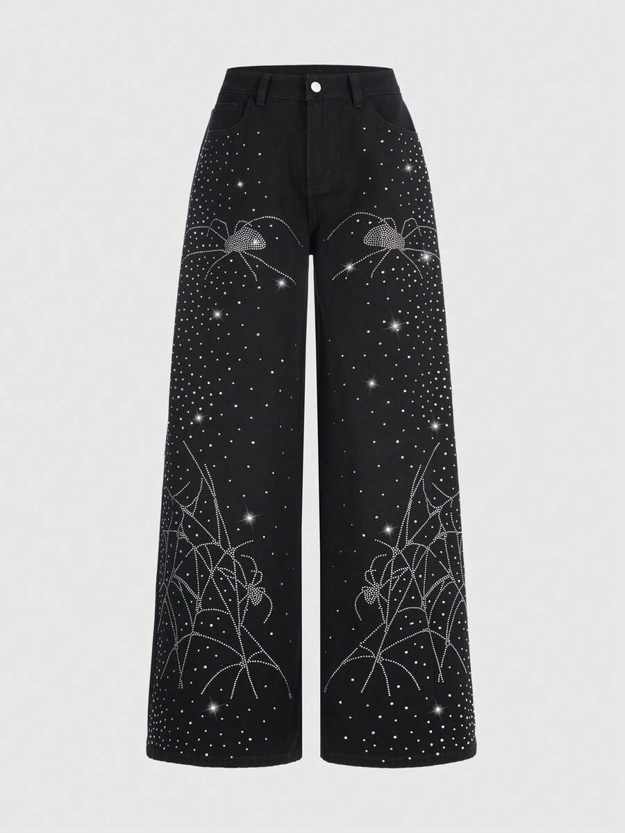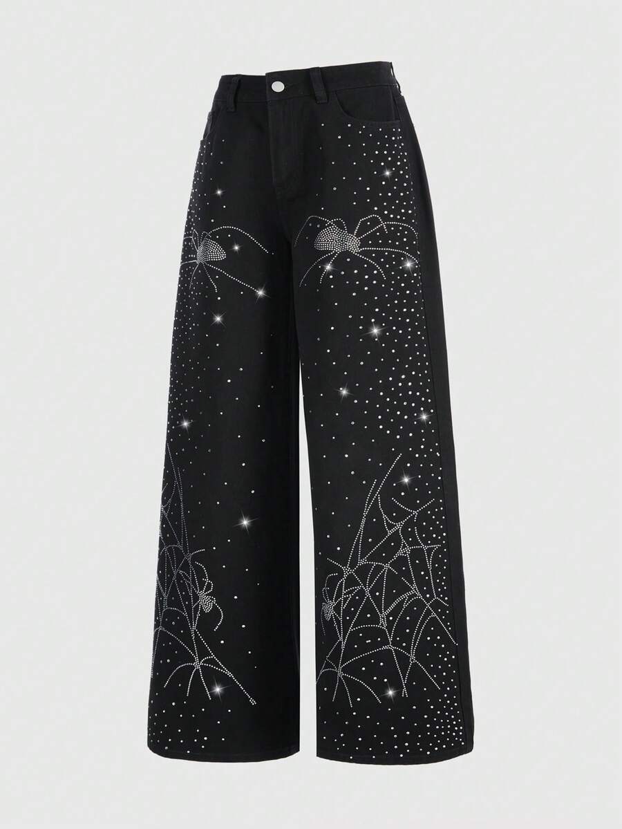 Grunge Punk Jeans à jambes larges et coupe ample, fortement ornés de strass. Design de niche pour femmes