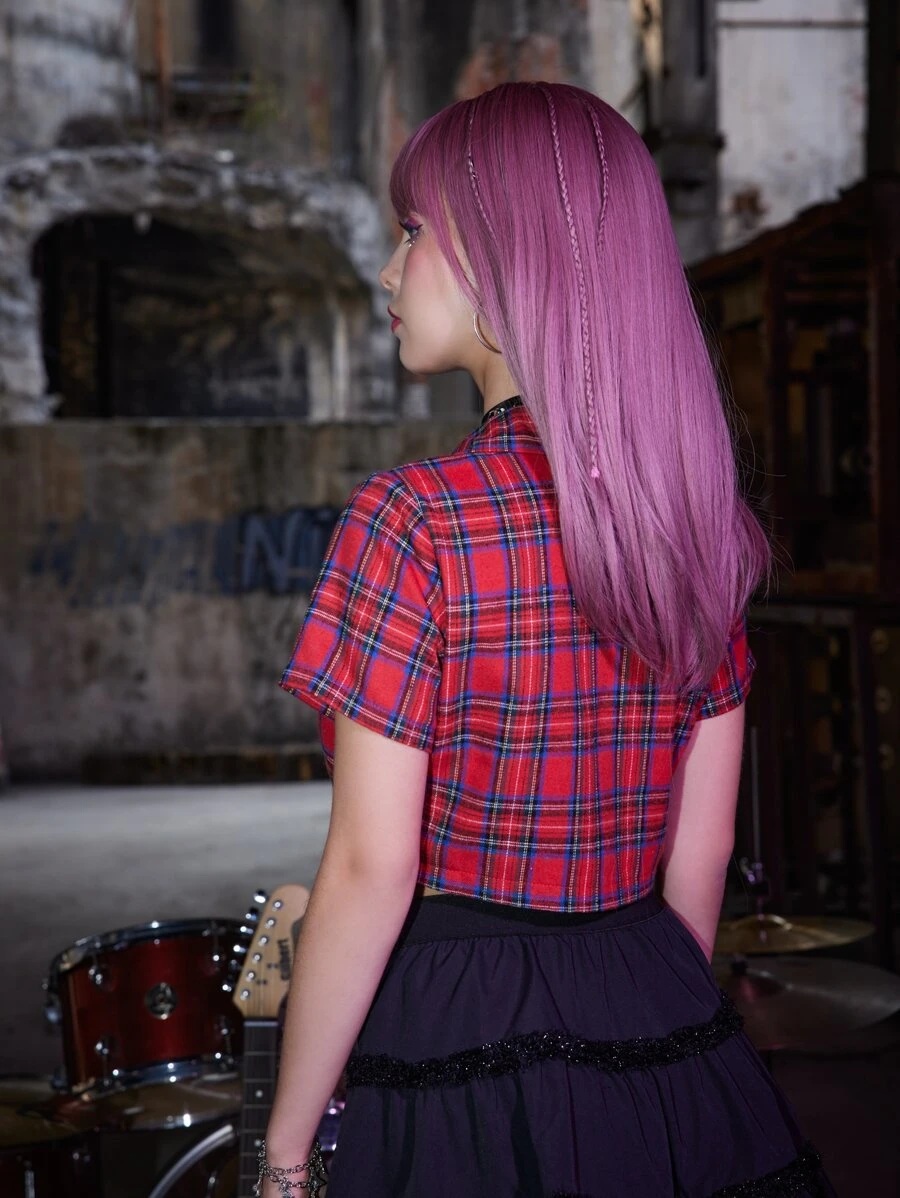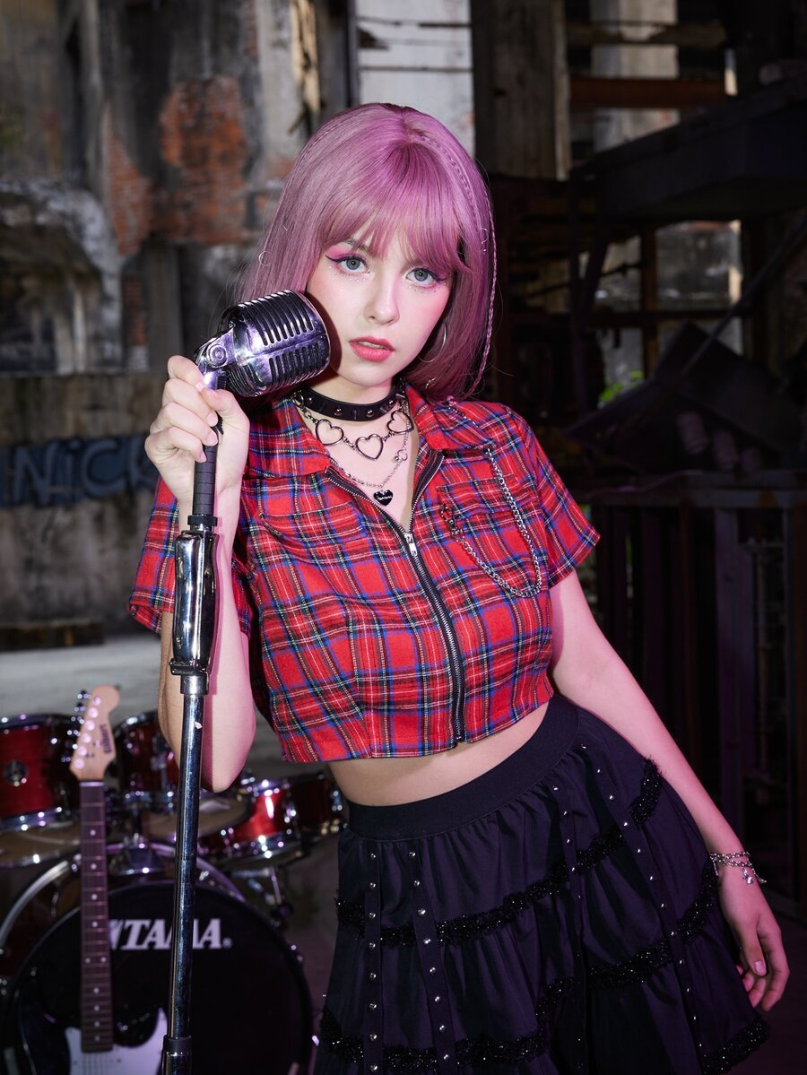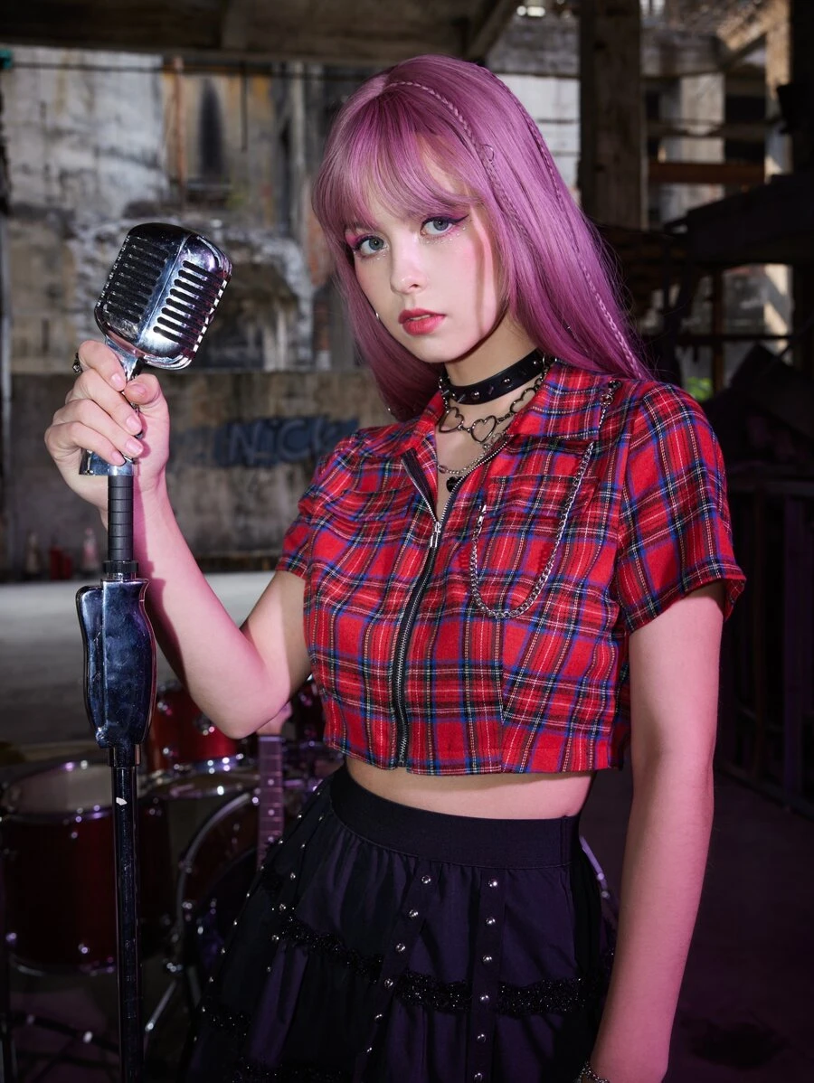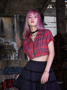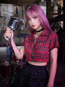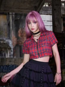 Grunge Punk Blouse courte à carreaux zippé chaîne