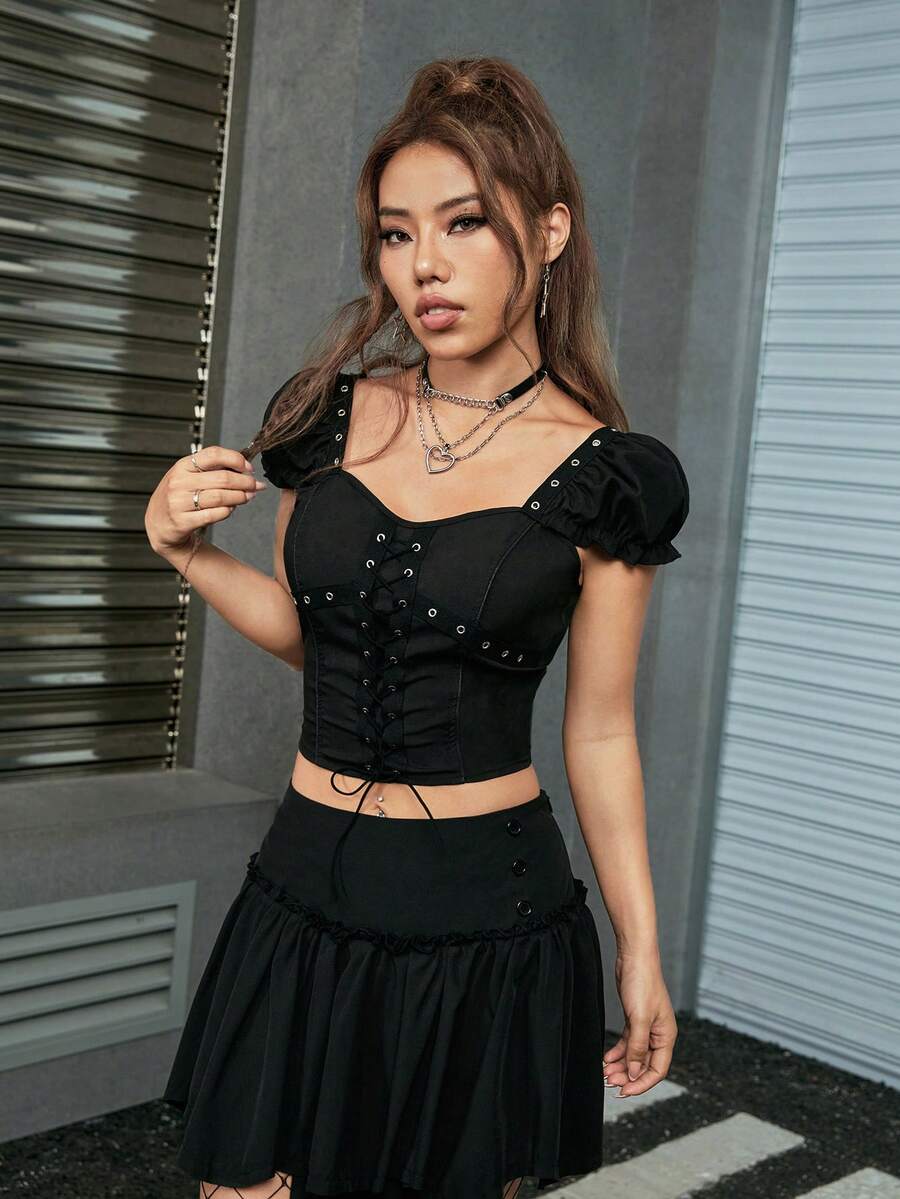 Grunge Punk Blouse courte à lacets manches bouffantes