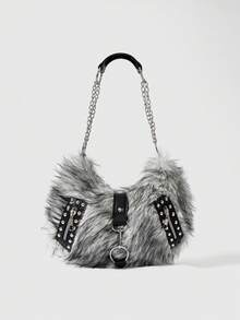 Grunge Punk Sac à épaule pour femmes, sac Hobo, fausse fourrure, sac moelleux, sac à rivets, mode, personnalisé, polyvalent, de rue, doux et cool pour filles, filles branchées, punk, Y2K, quotidien, automne et hiver (motif aléatoire)