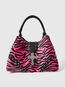 Grunge Punk Sac à épaule pour femmes, sac Hobo, imprimé zébré, imprimé animal, simili-cuir noir mélangé, mode, personnalité, punk, gothique, décoration de matériel de croix gothique, simple, polyvalent, de rue, doux et cool pour les filles, les filles , Y2K, rétro, rivets, vintage