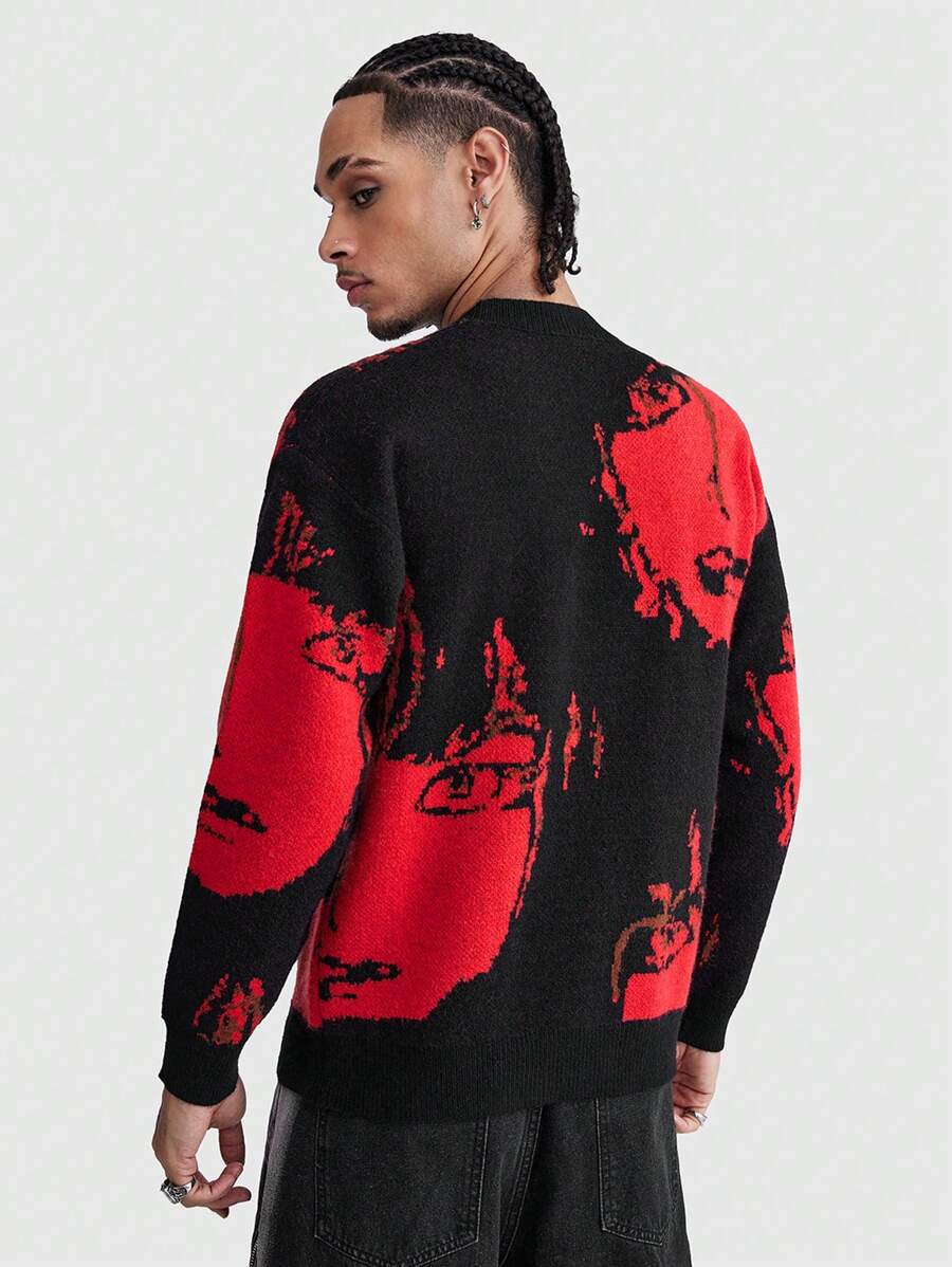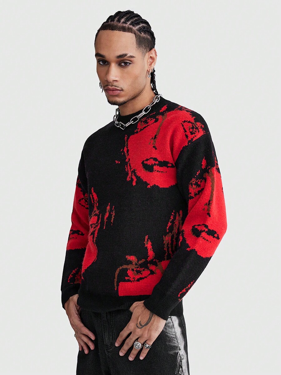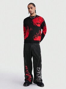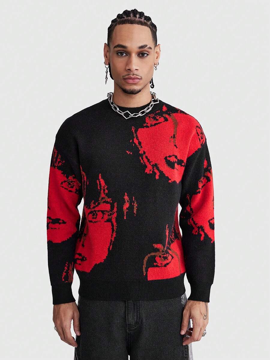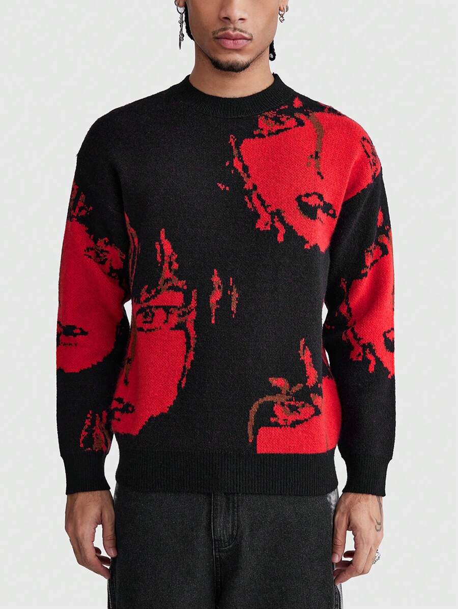 Grunge Punk Pull col rond imprimé figure colorbloc décontracté pour hommes, automne hiver, école