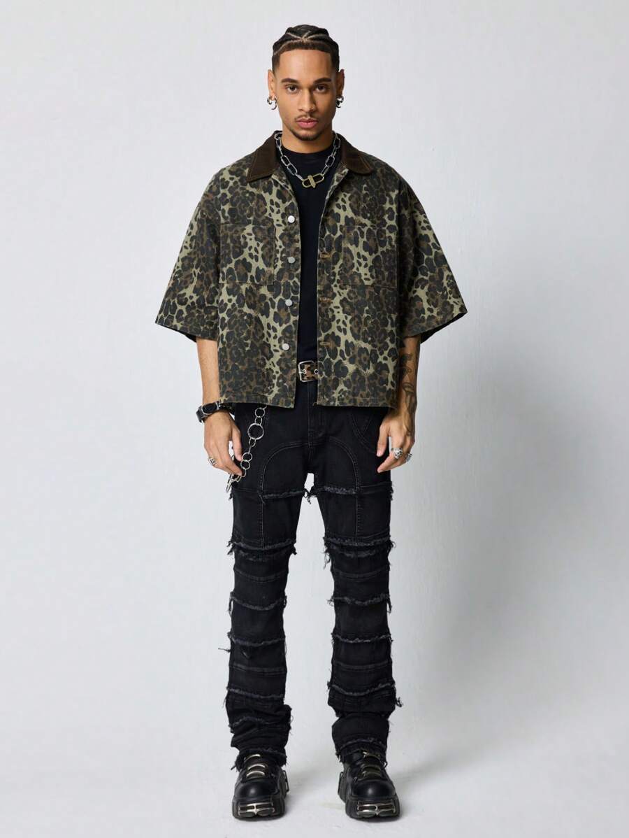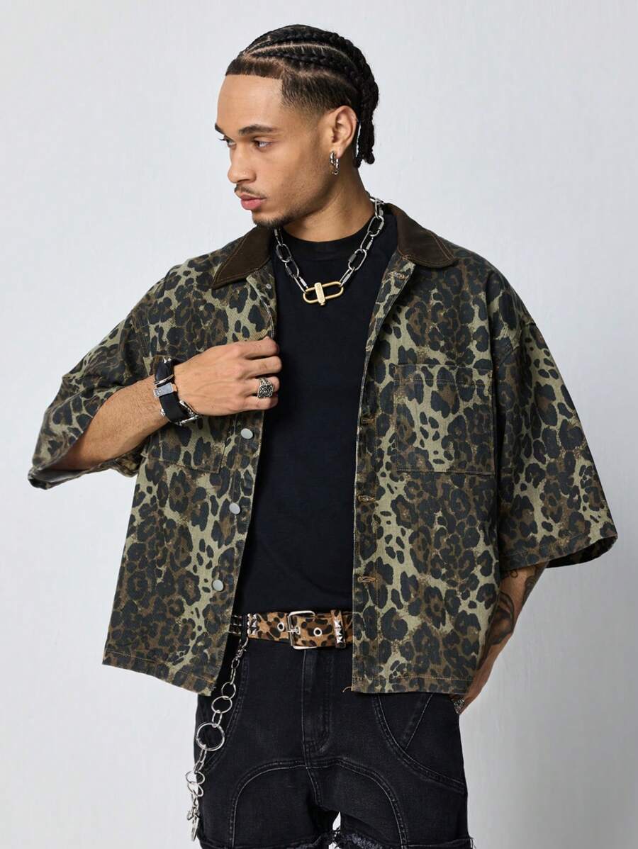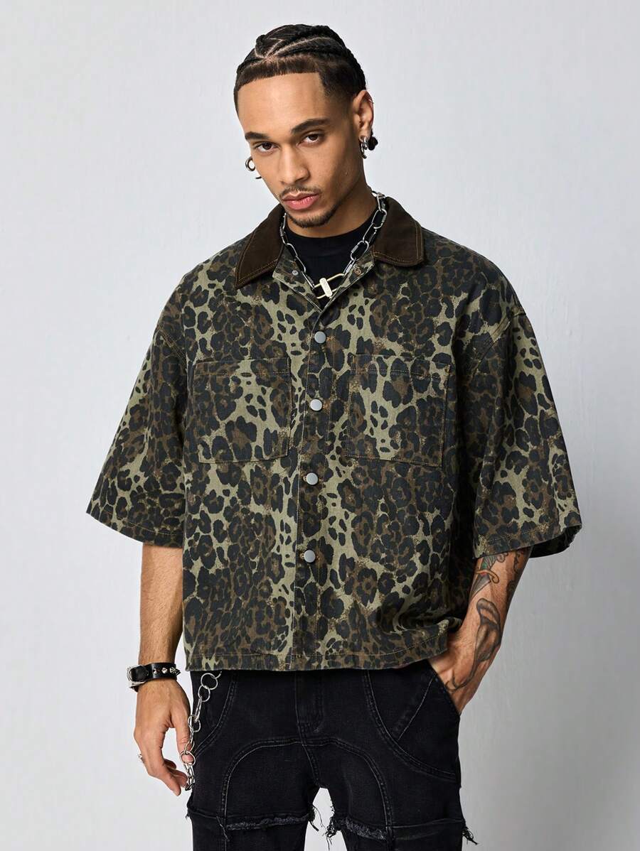 Grunge Punk Chemise en denim à poche à simple boutonnage avec imprimé camouflage pour hommes