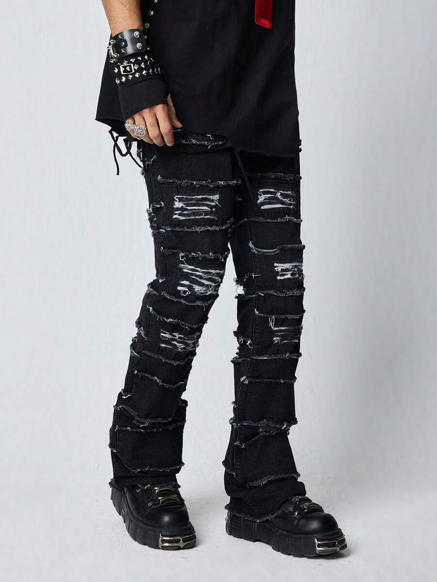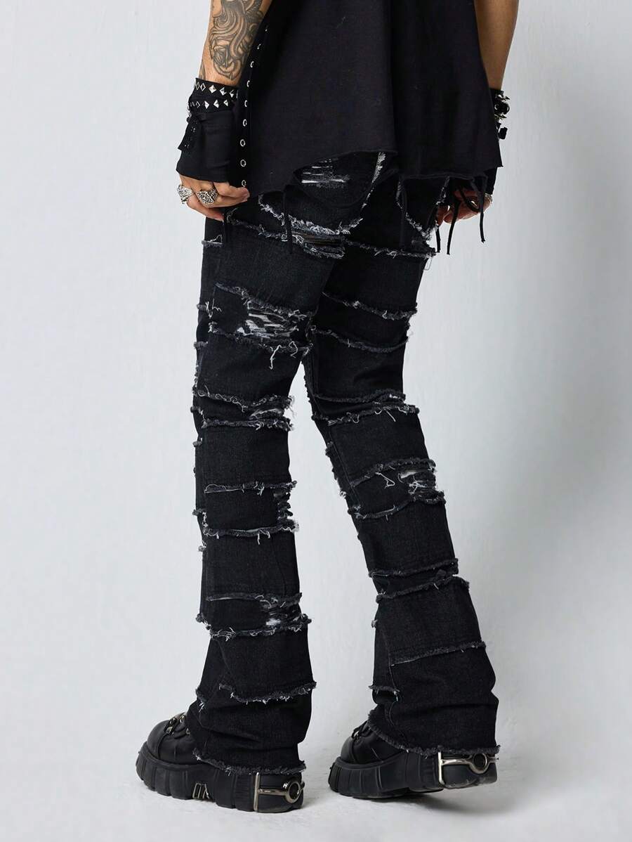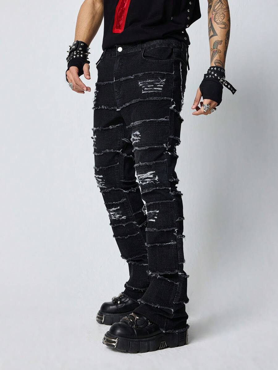 Grunge Punk Jeans bruts à poche simple pour hommes, porter décontracté au quotidien