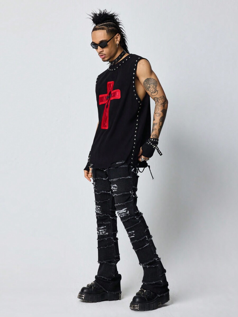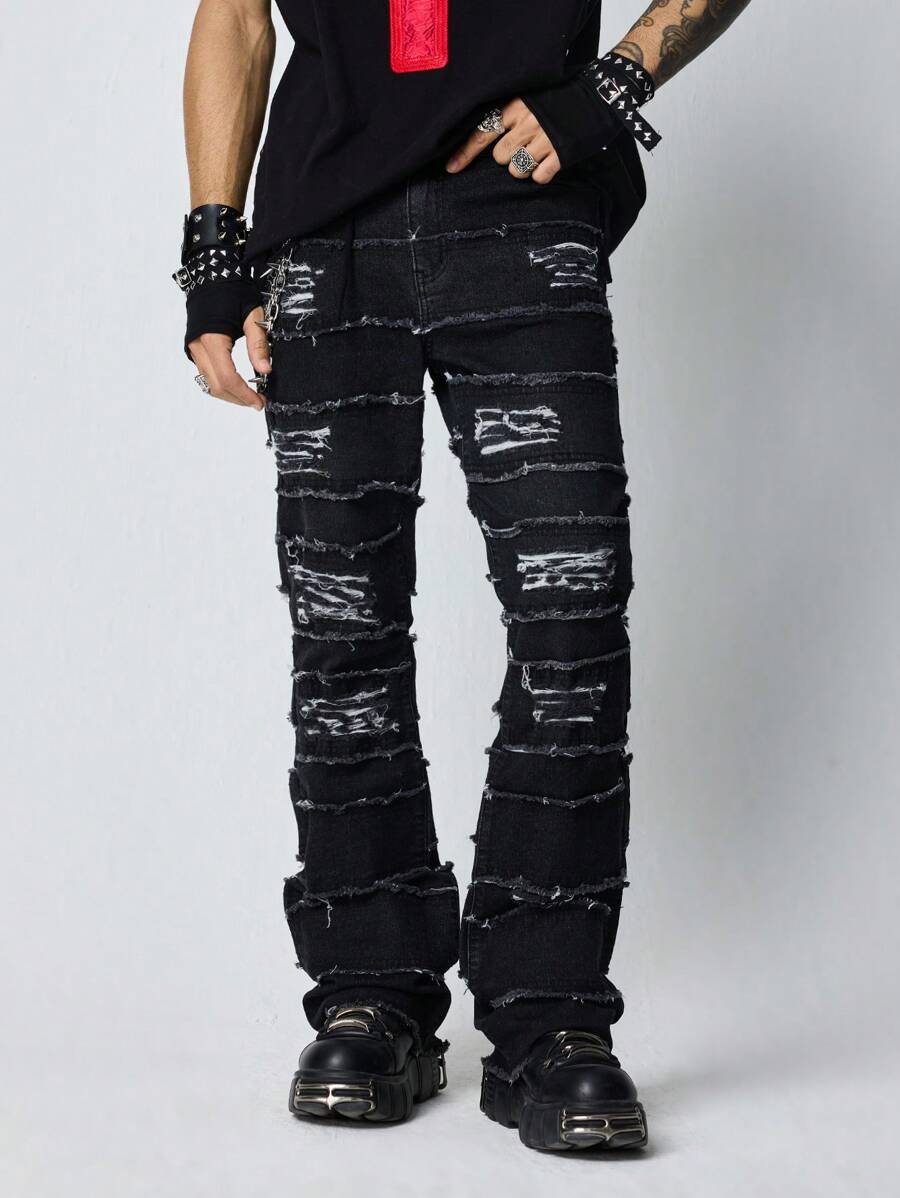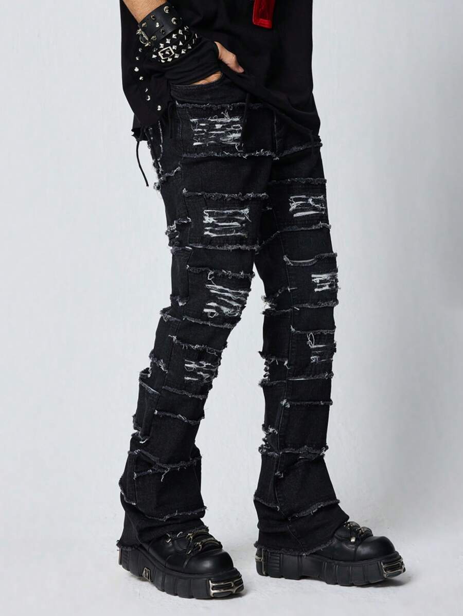 Grunge Punk Jeans bruts à poche simple pour hommes, porter décontracté au quotidien