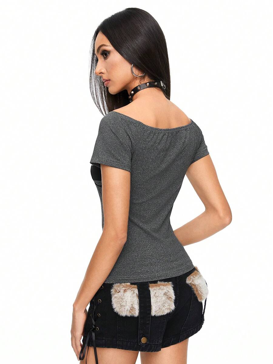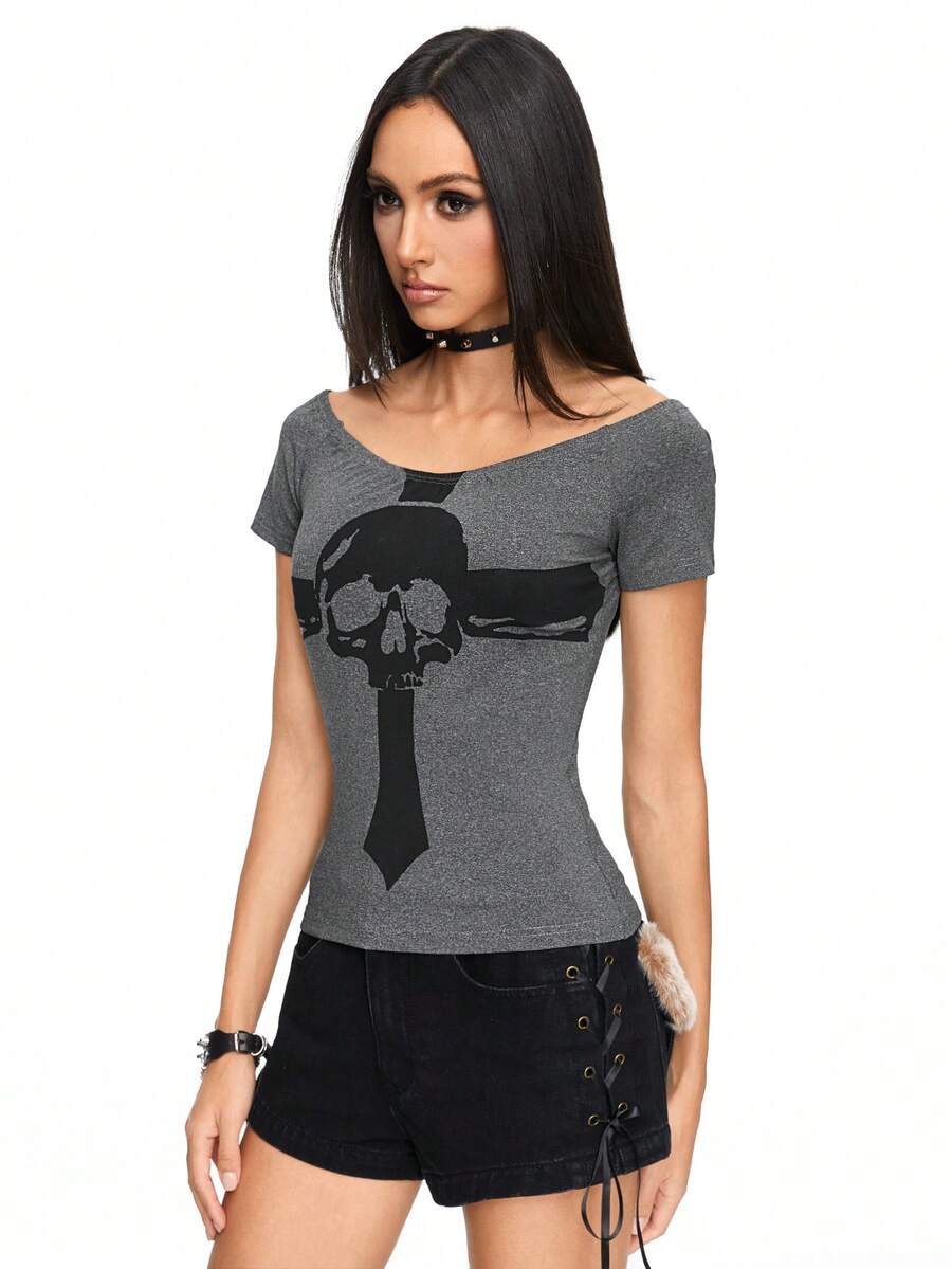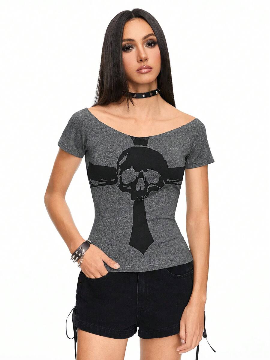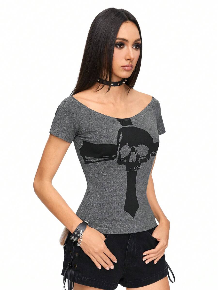 Grunge Punk T-shirt pour femmes de style punk métallique foncé pour festival de musique avec crâne et croix imprimés en feuille d'argent, coupe ajustée épaules dénudées et col en V