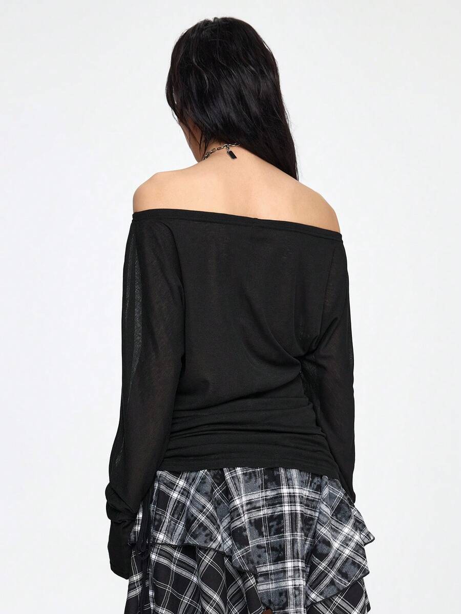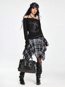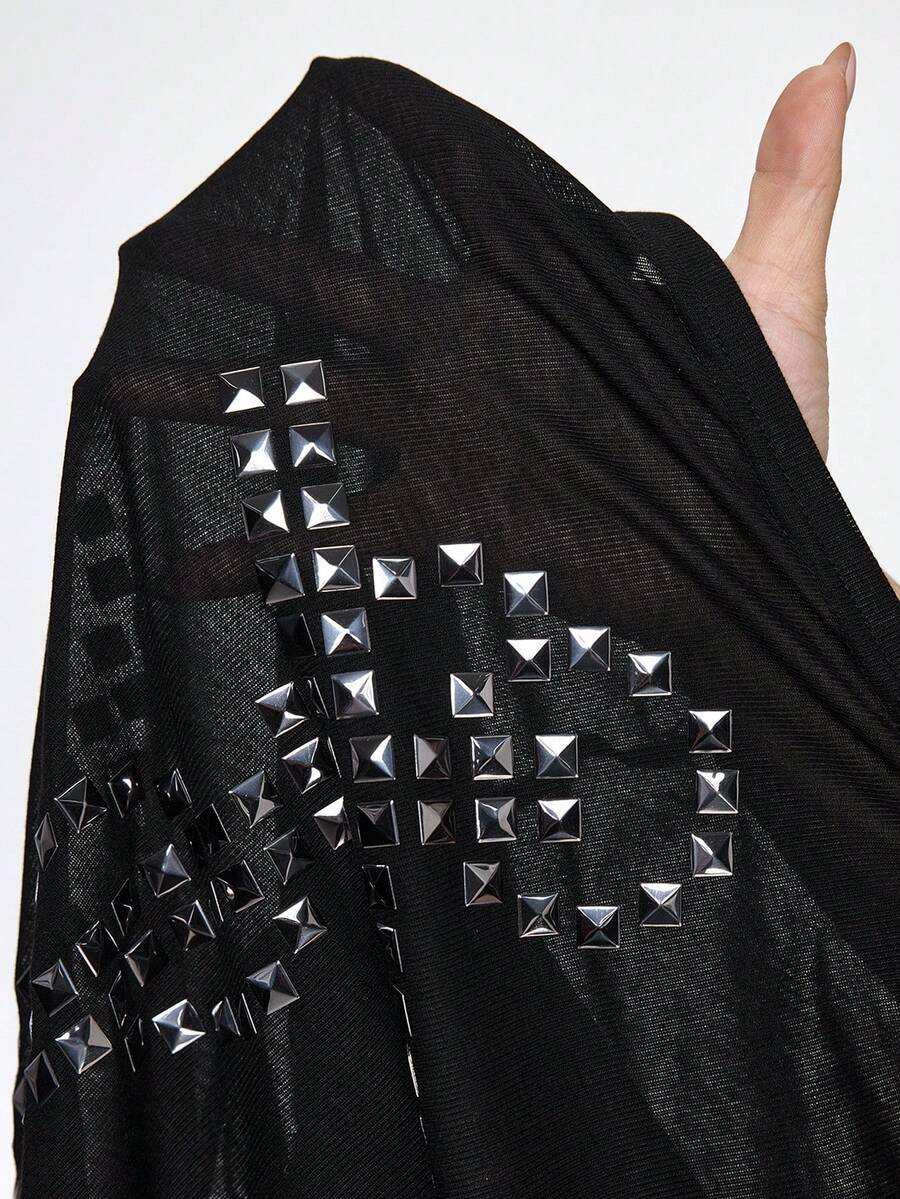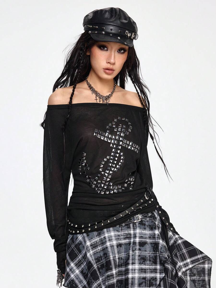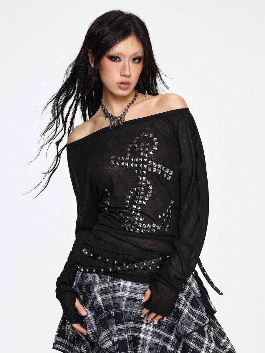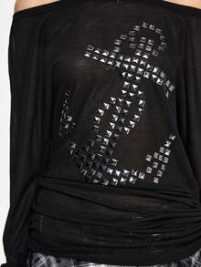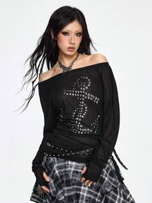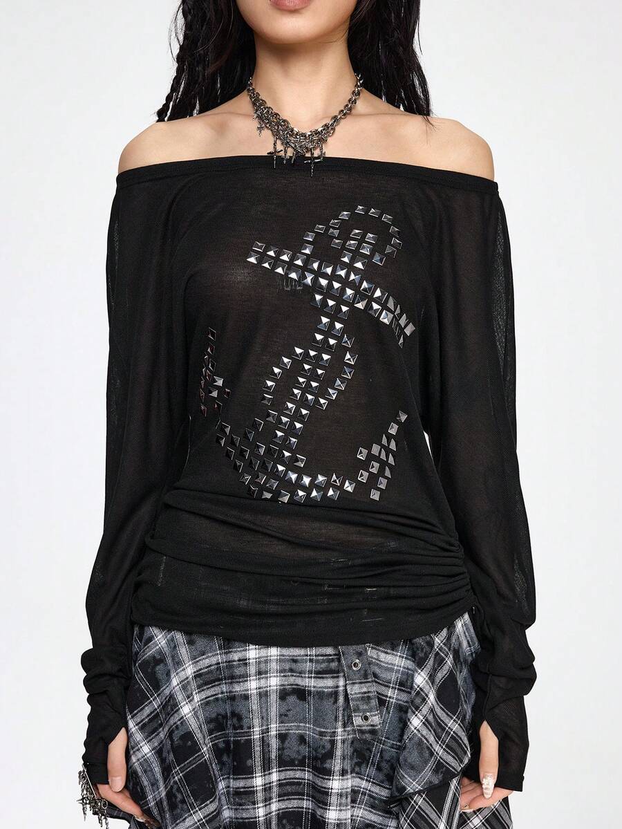 Grunge Punk Blouse transparente à manches longues et à une épaule, style punk marine avec ancre et rivets