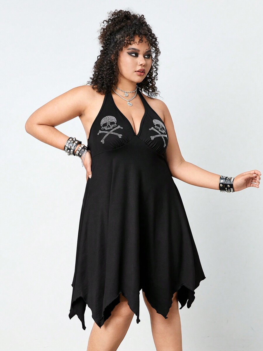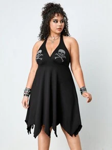 Grunge Punk Robe asymétrique avec tête de mort et strass au col bêche, pour grandes tailles