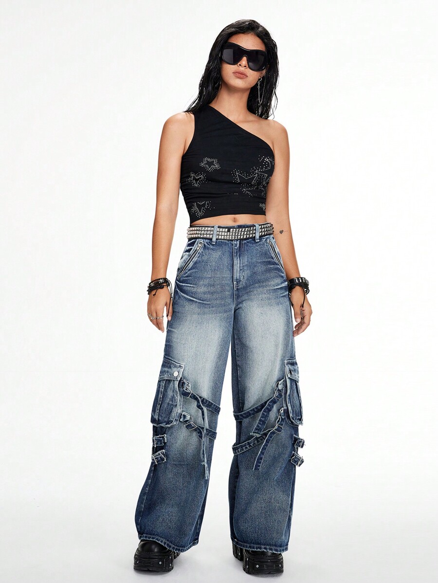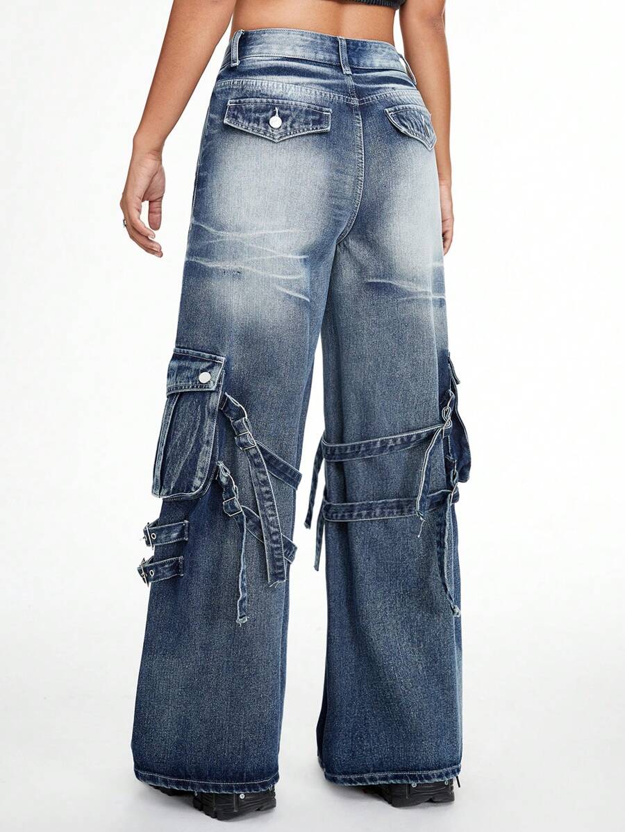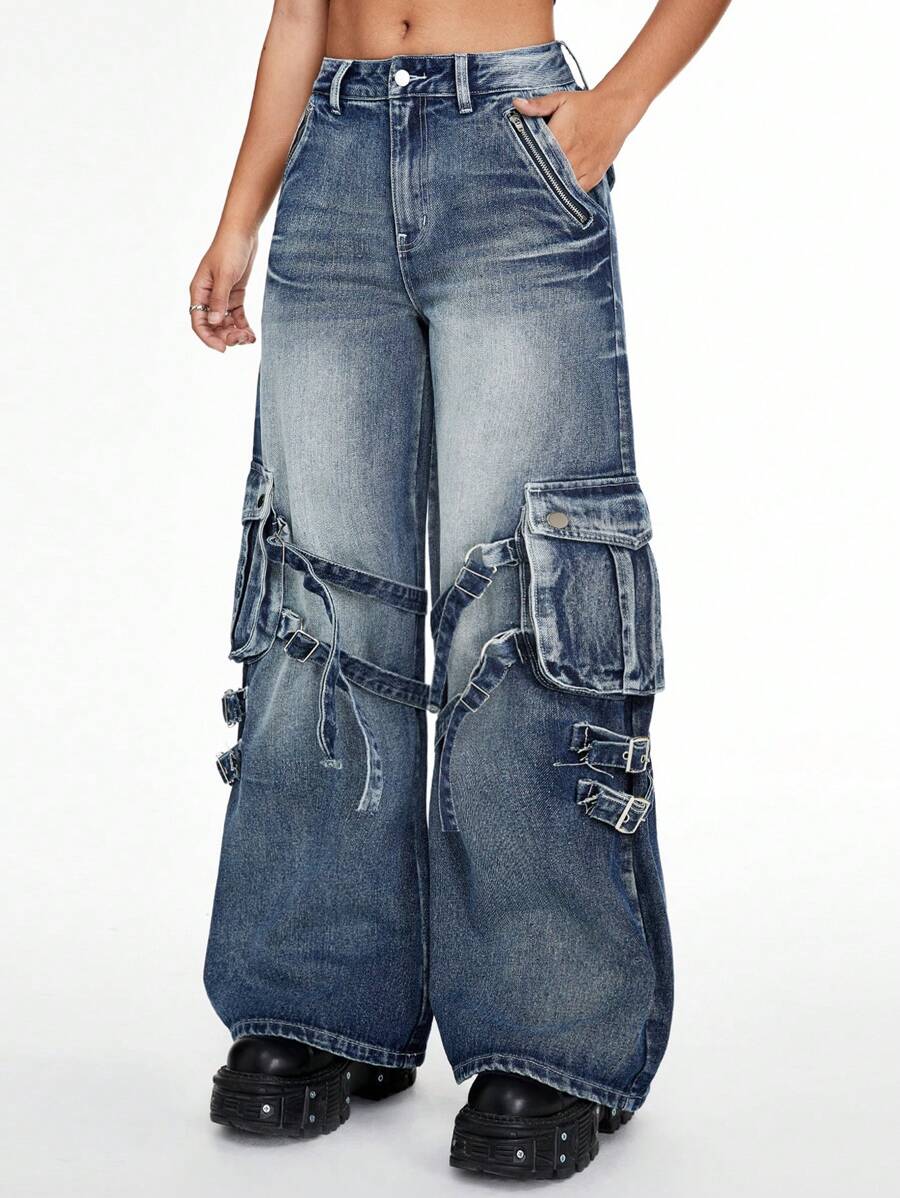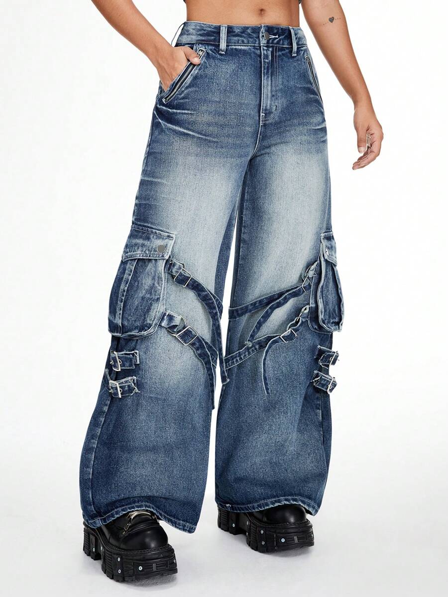 Grunge Punk Jeans boyfriend femme ample et décontracté avec poche cargo, style punk délavé