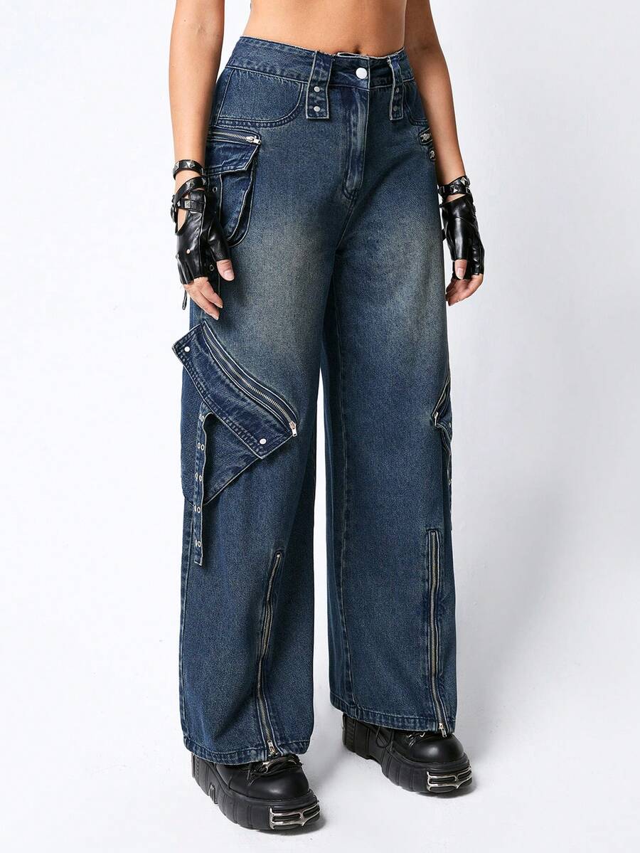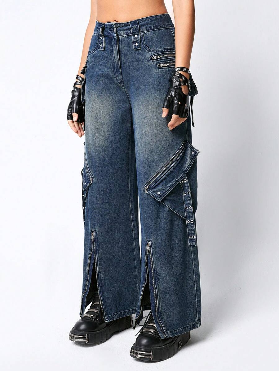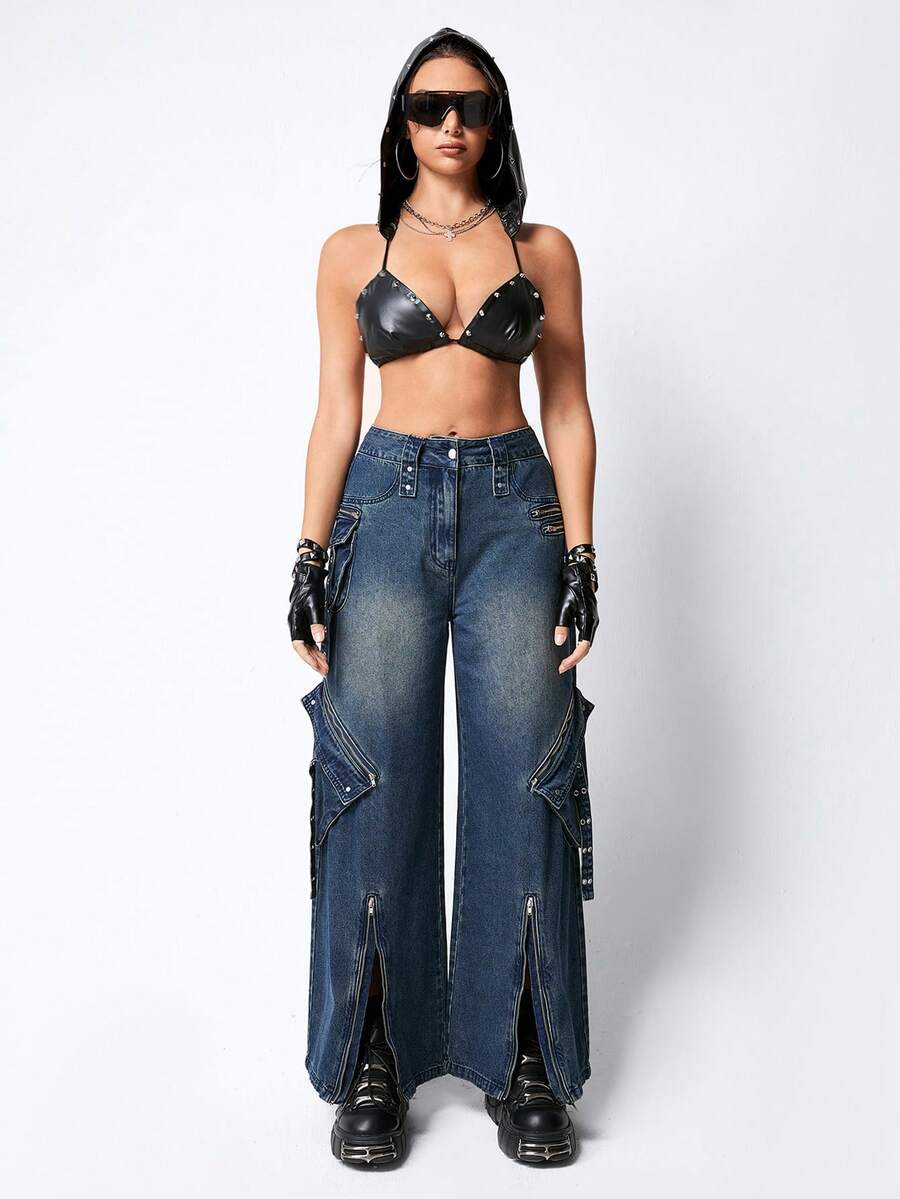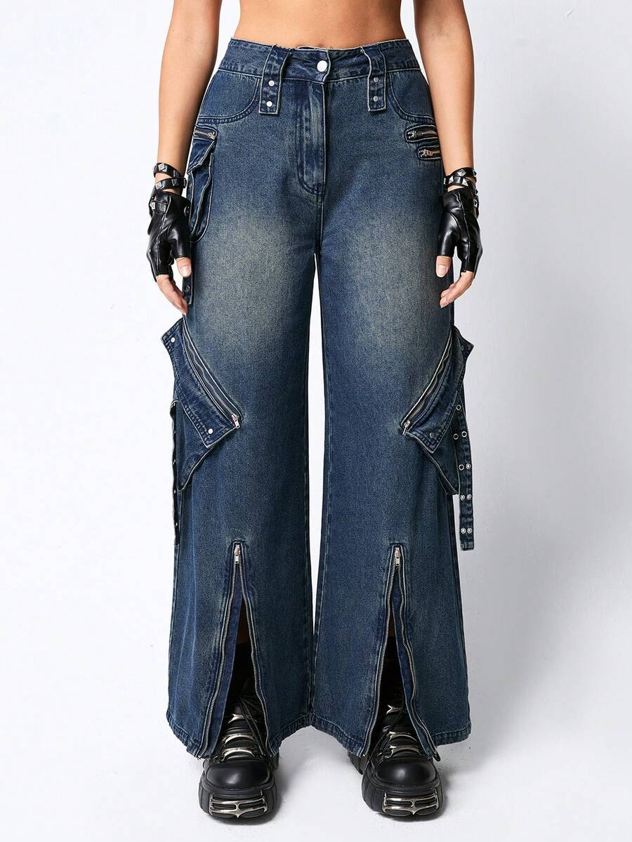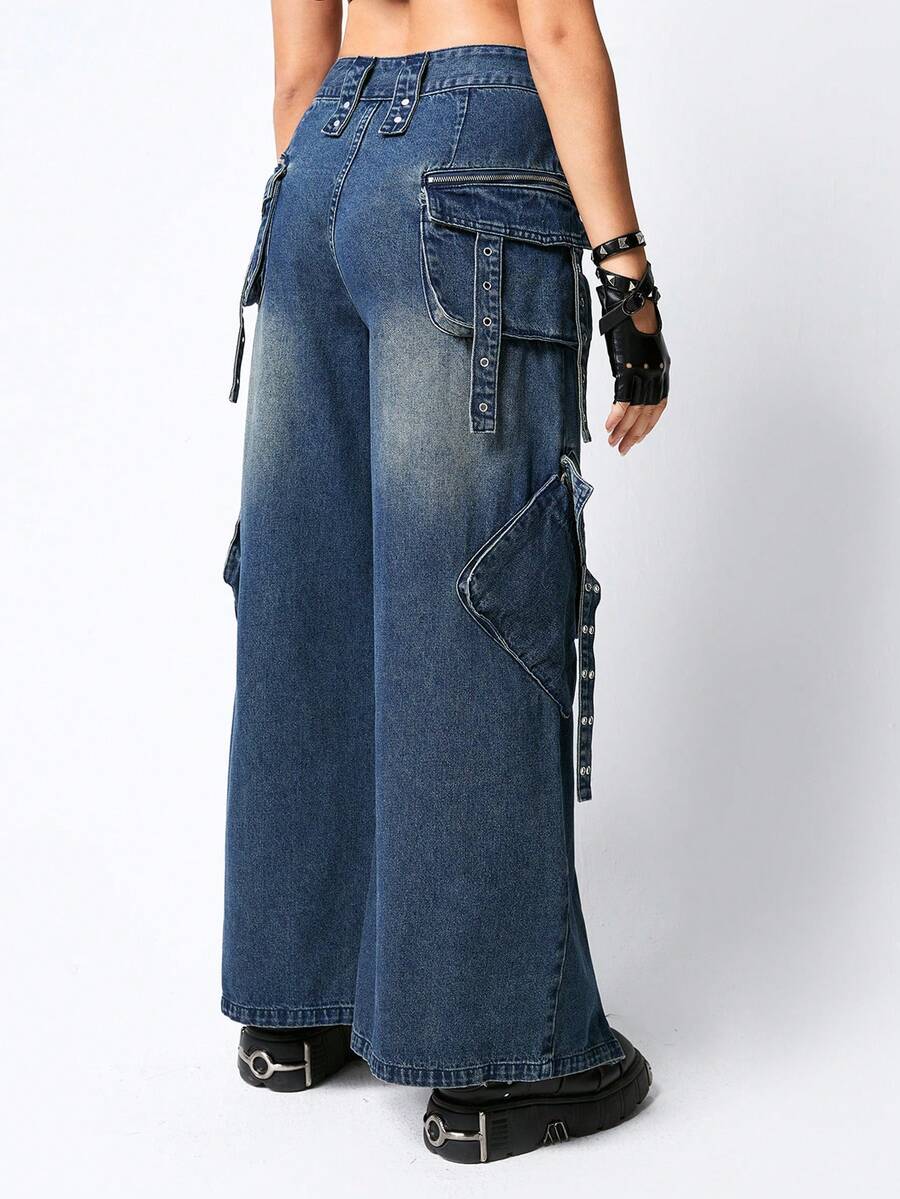 Grunge Punk Pantalon en jean large à poches lourdes et décorées de métal punk en trois dimensions, pour femmes, approprié pour l'école