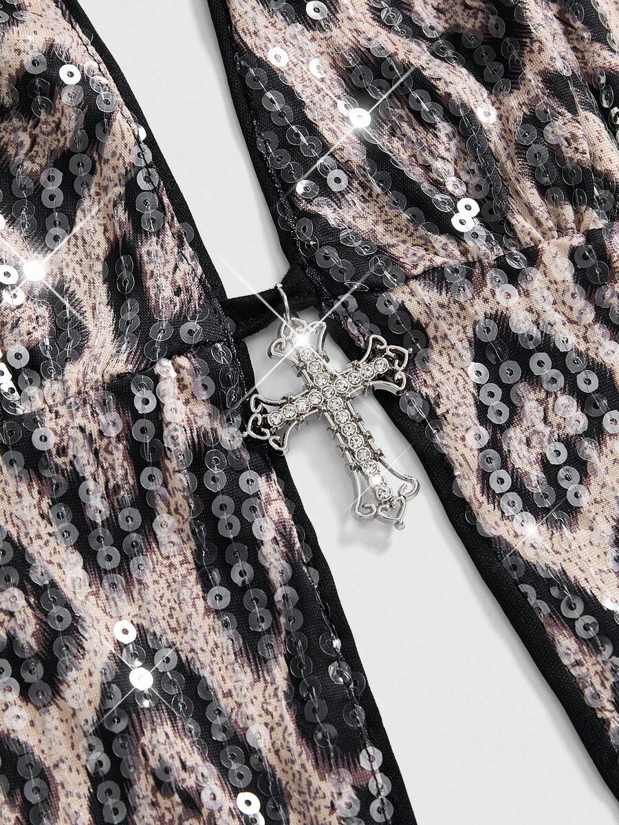 Grunge Punk Top débardeur femme sexy à pendentif croix pailleté léopard, style punk rock chic pour fête de plage d'été, événement musical de festival, style de rue Y2K