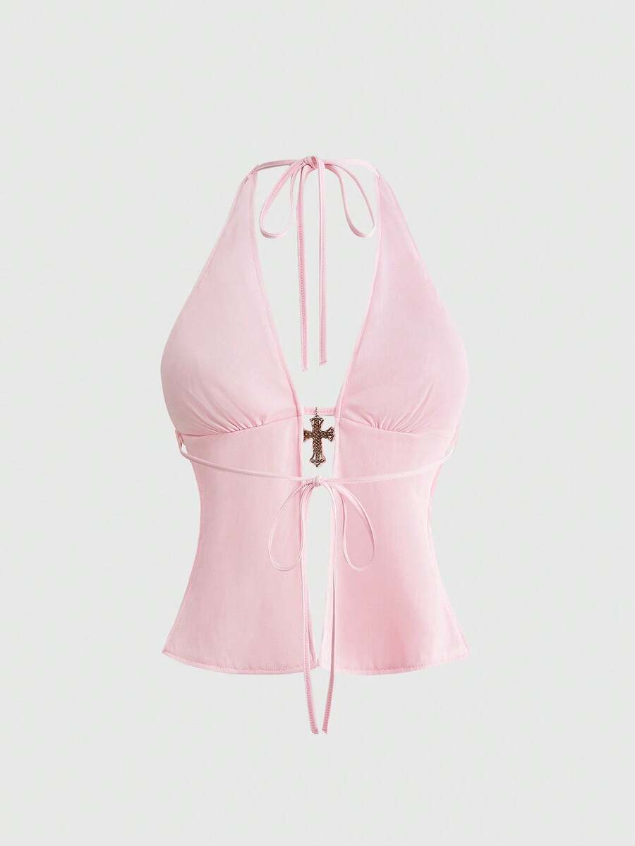 Grunge Punk Tenue de fête punk rock diva, costume pour événement musical de festival du Nouvel An, débardeur femme sexy à col ras-du-cou avec pendentif croix pailleté, style Y2K millénaire