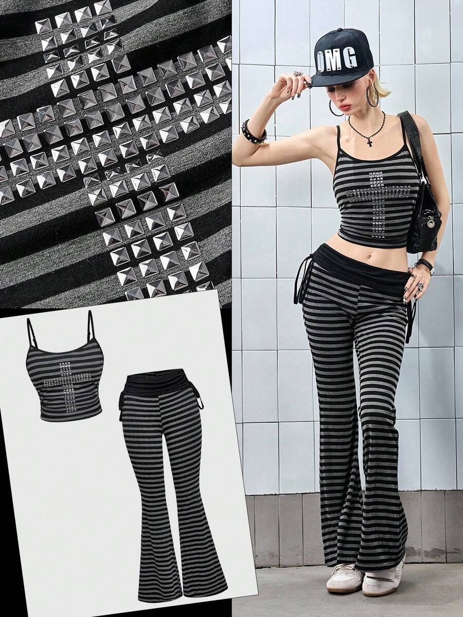 Grunge Punk Ensemble 2 pièces top court rayé rivet croix sexy punk Y2K et pantalon évasé pour femmes