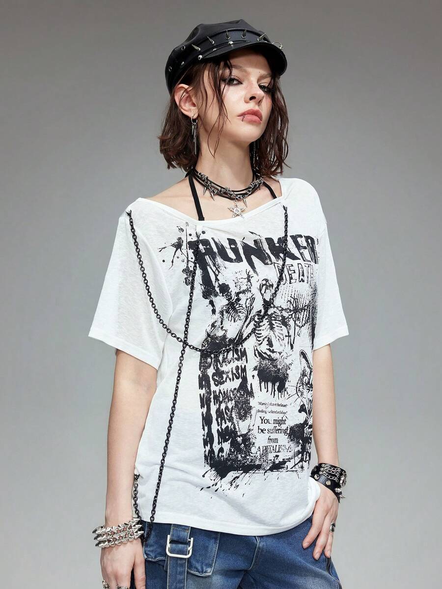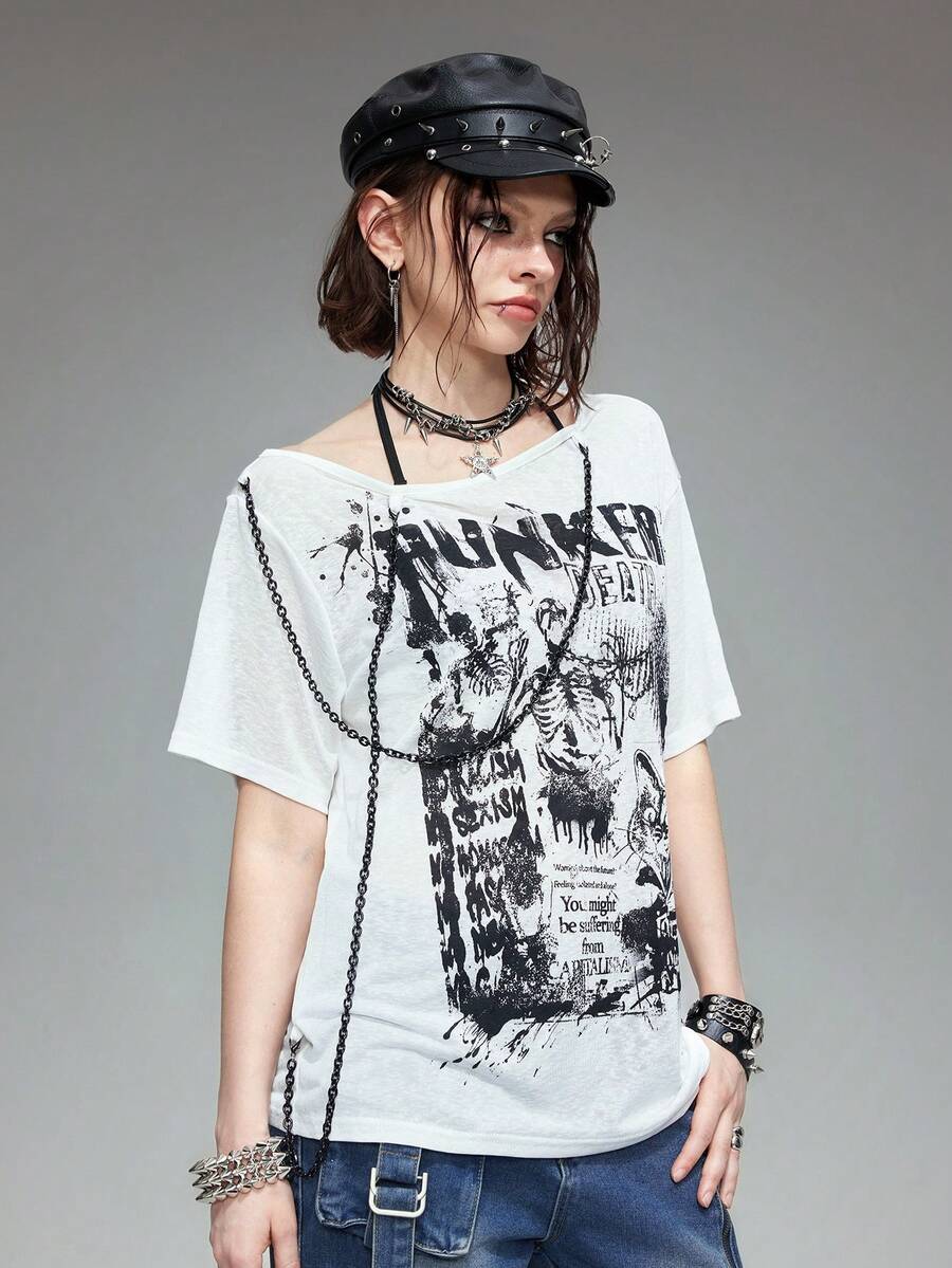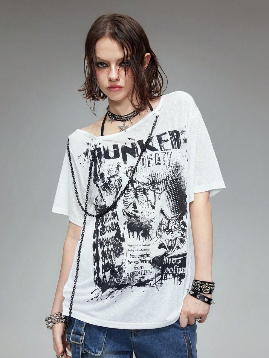 Grunge Punk T-shirt ample en fibre de bambou pour femmes avec impression de silhouette de squelette punk et épaule oblique transparente