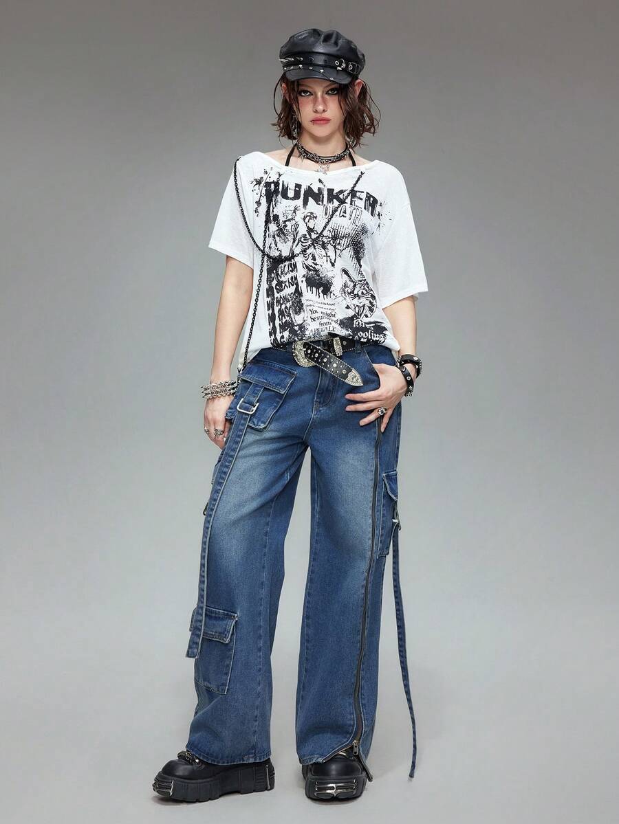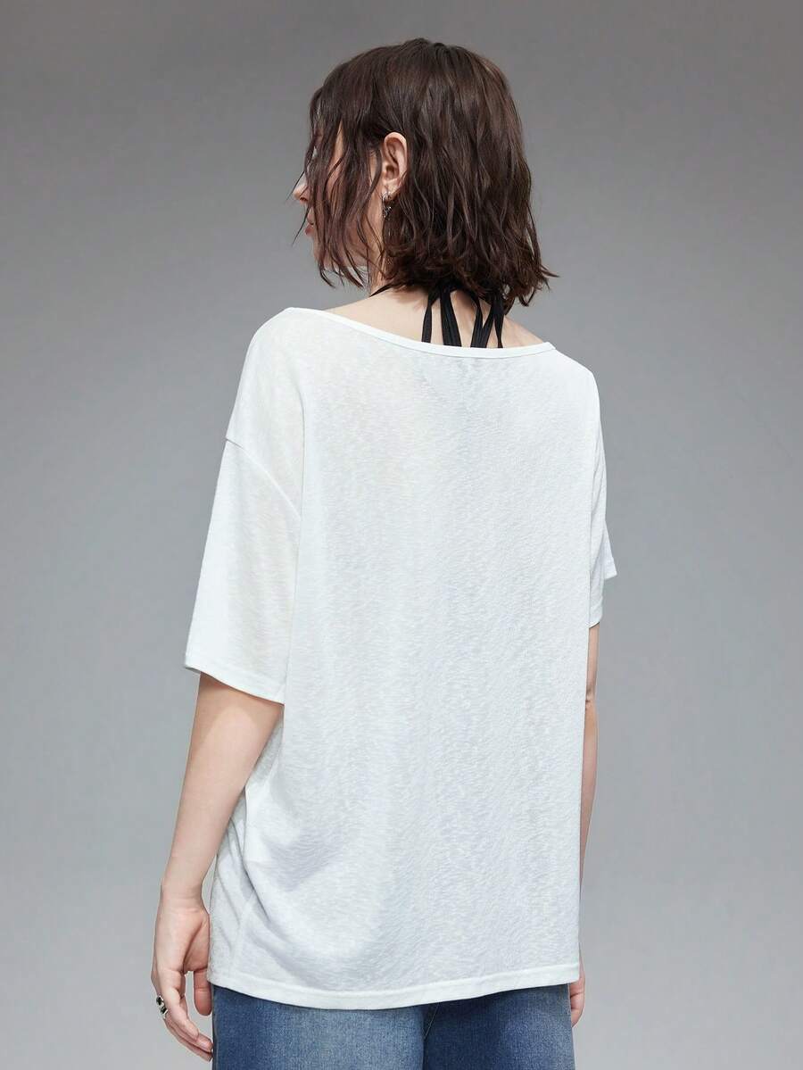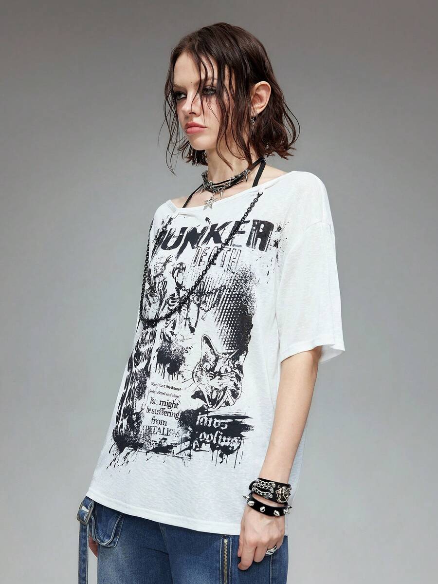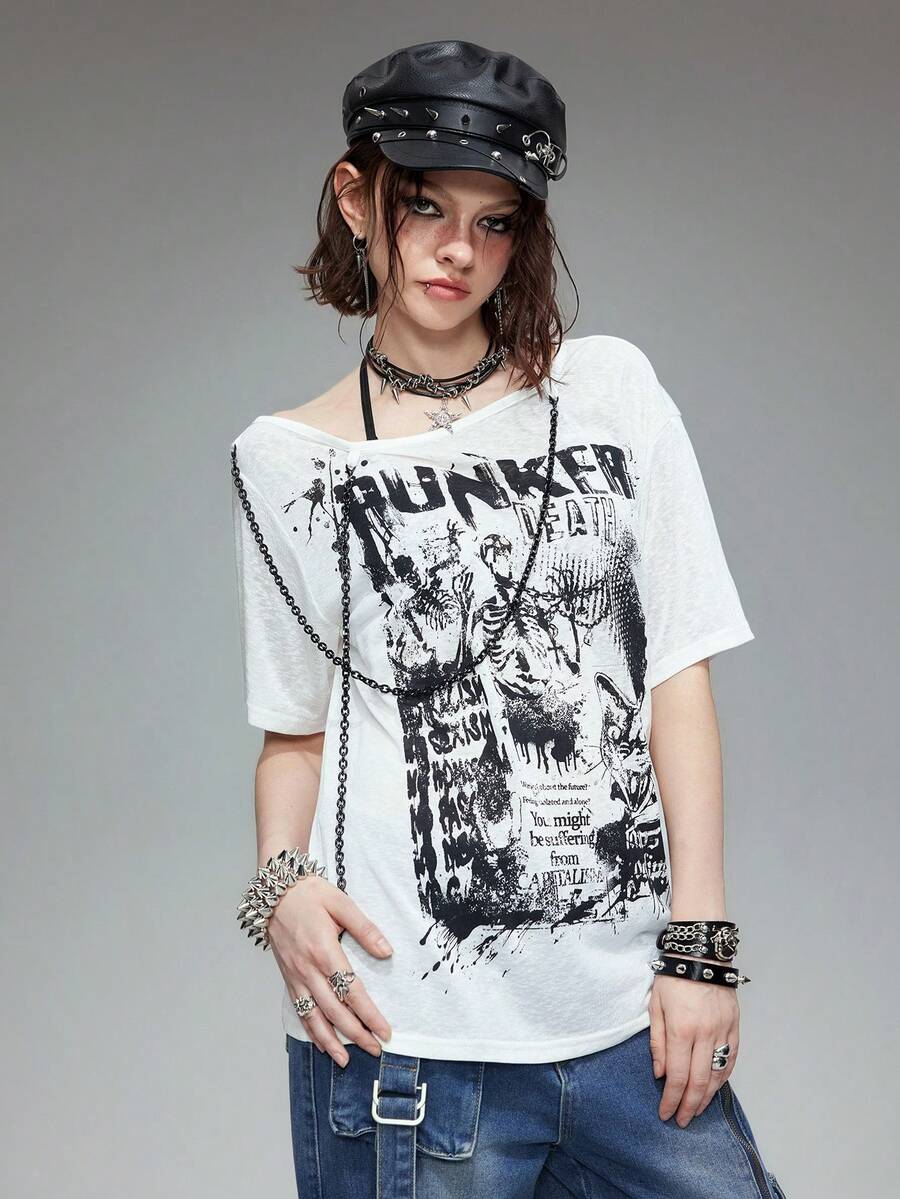 Grunge Punk T-shirt ample en fibre de bambou pour femmes avec impression de silhouette de squelette punk et épaule oblique transparente