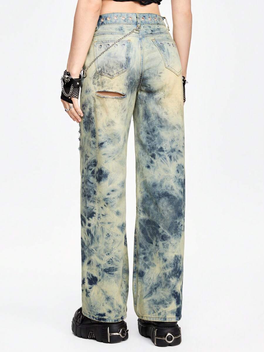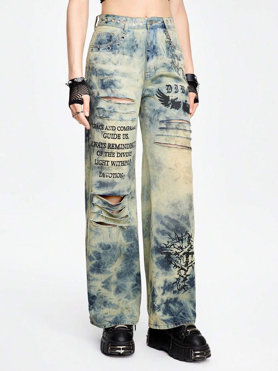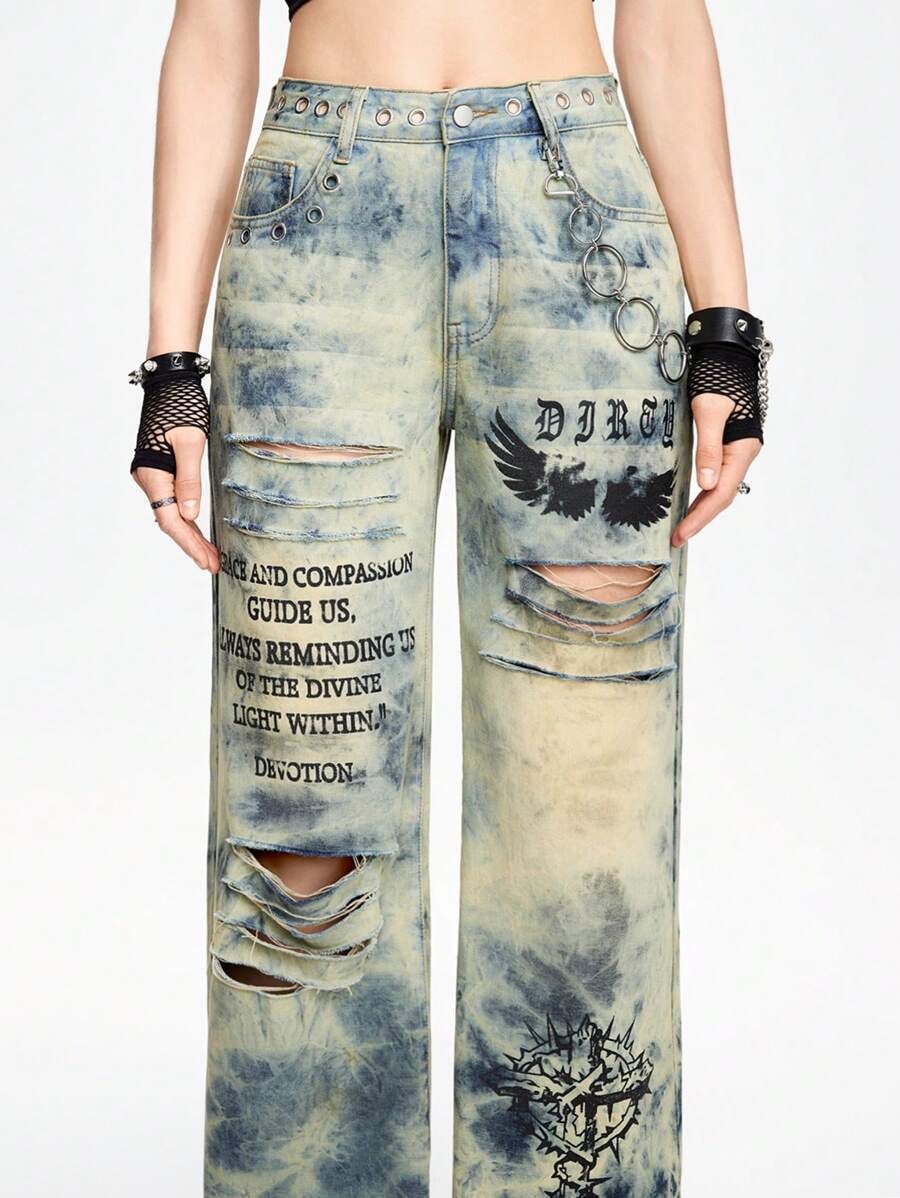 Grunge Punk Jeans pour femmes de style punk avec design de taille en métal ajouré, lavage tie-dye et imprimé lettres