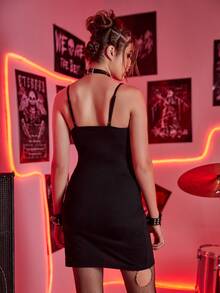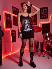 Grunge Punk Robe à fines brides à imprimé squelette en dentelle