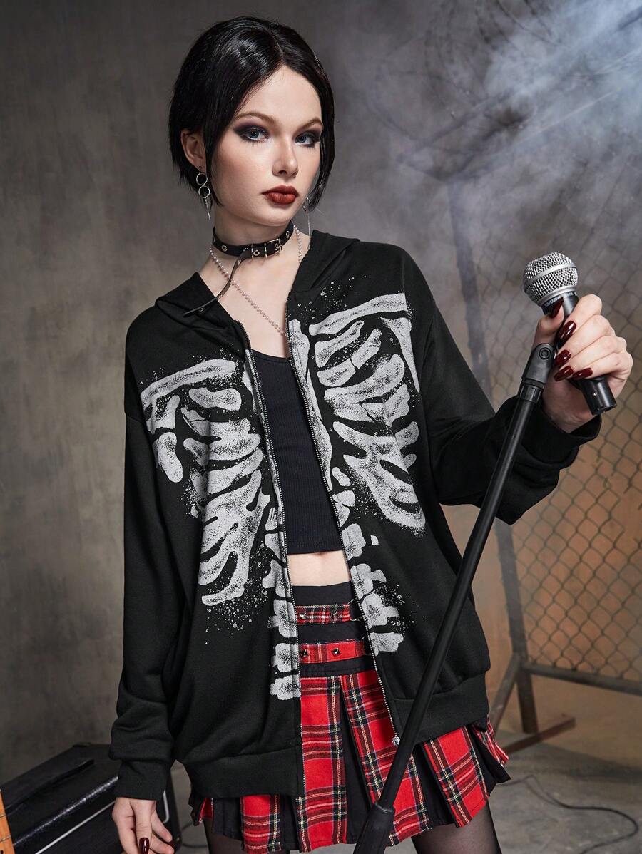 Grunge Punk Sweat-Shirt À Capuche Zippé Imprimé Squelette