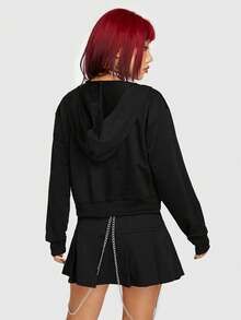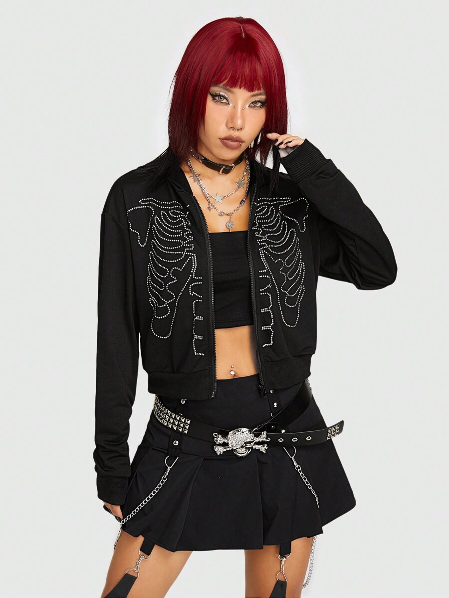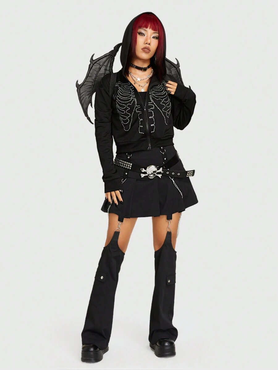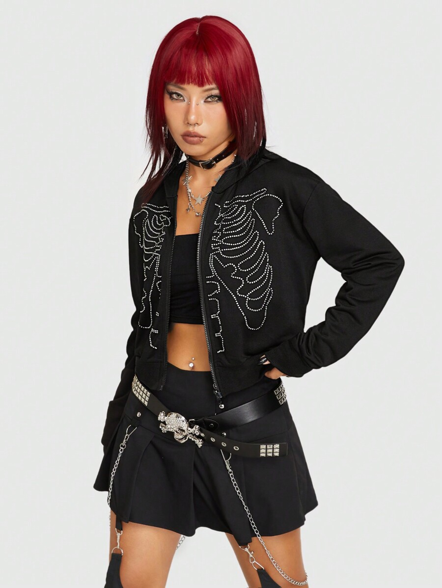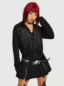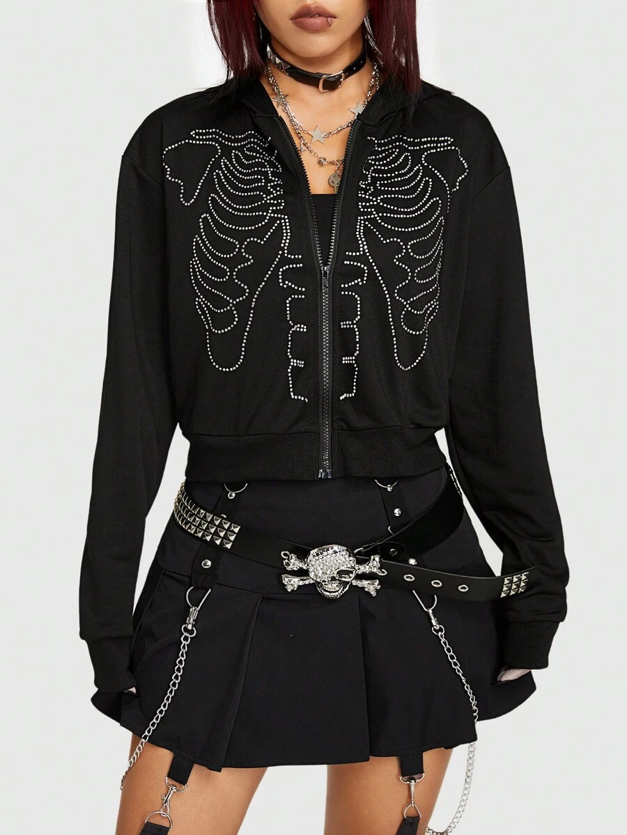 Grunge Punk Sweat-Shirt À Capuche Zippé Squelette À Strass