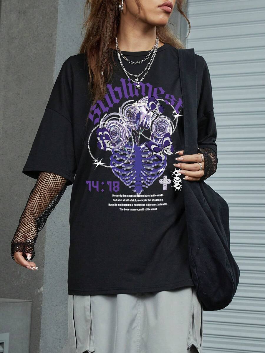Grunge Punk T-shirt Squelette & Graphique De Slogan