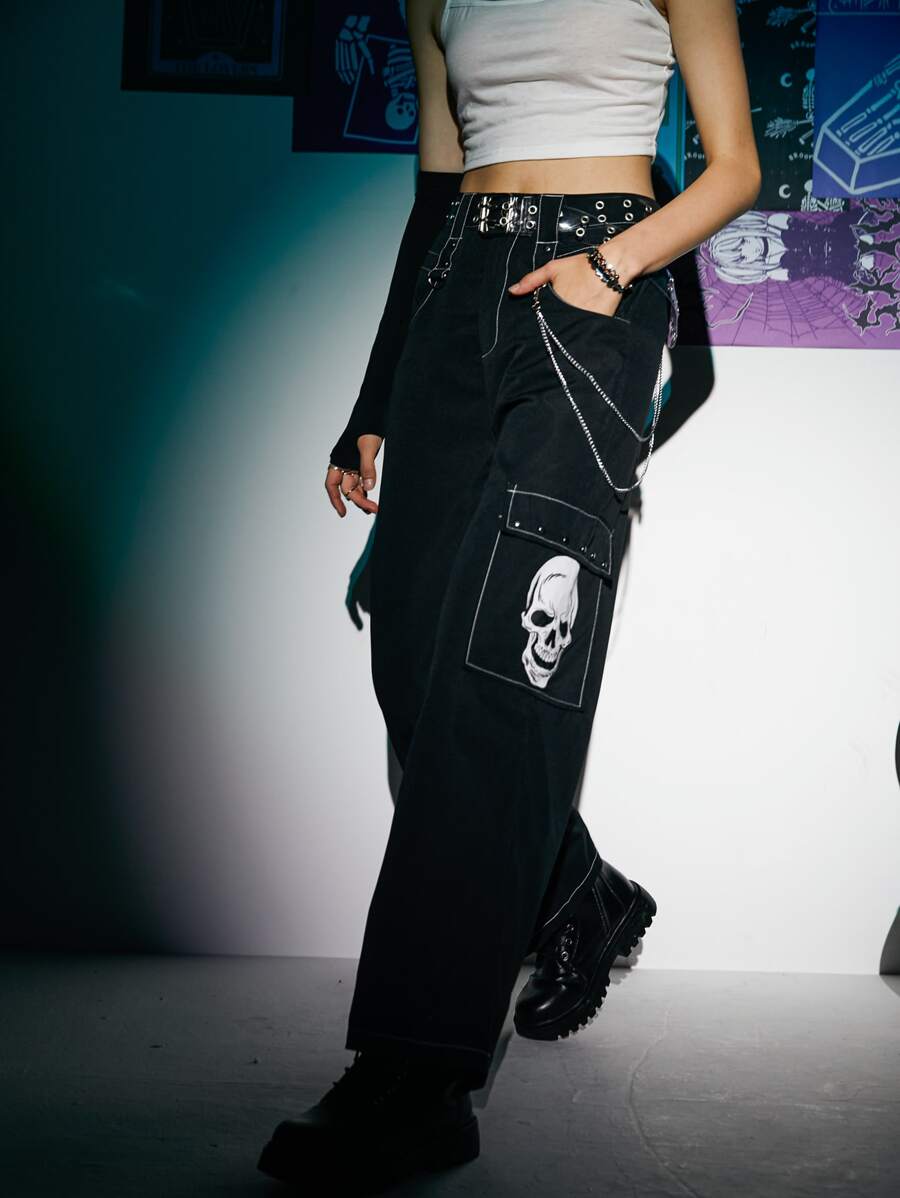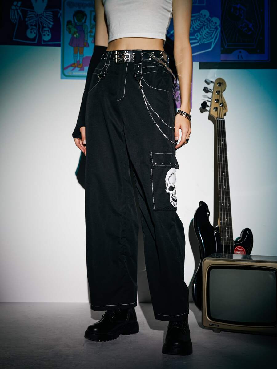 Grunge Punk Pantalon avec lien de contraste avec graphique de crâne, école
